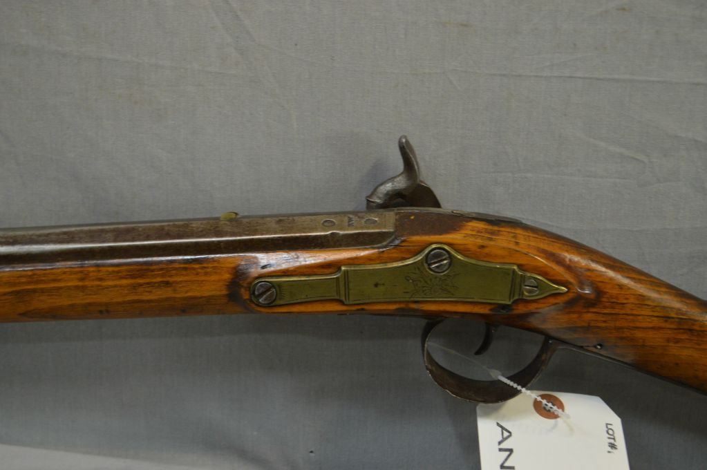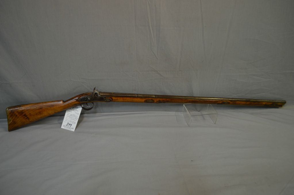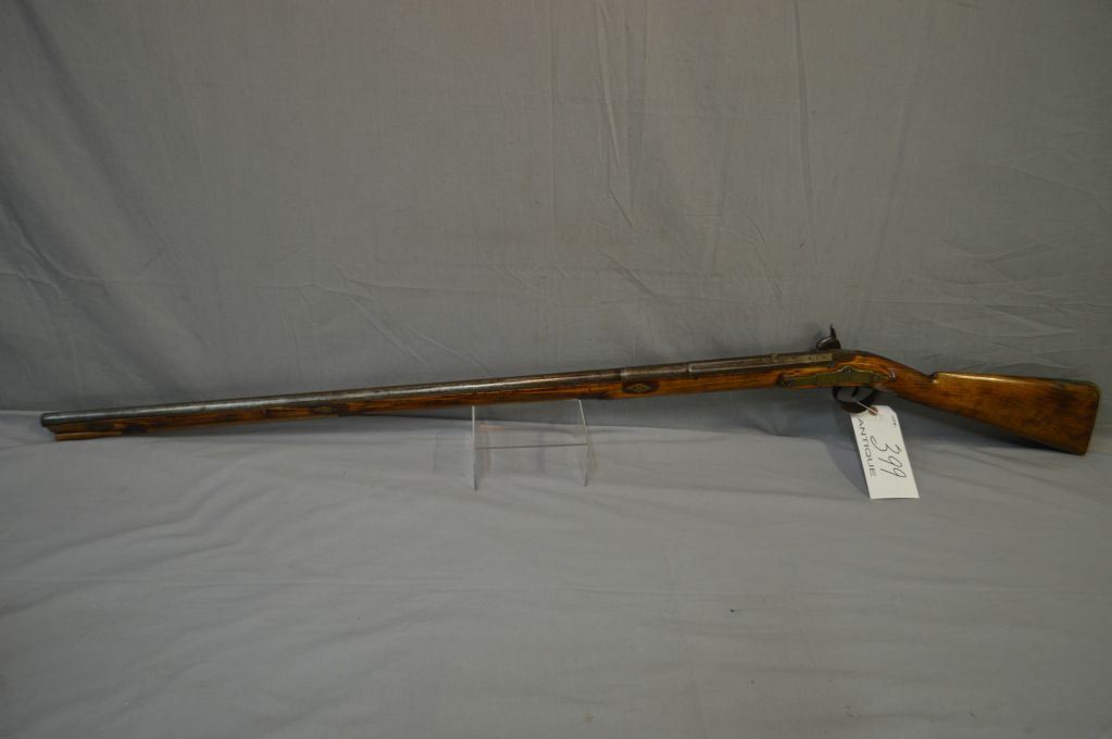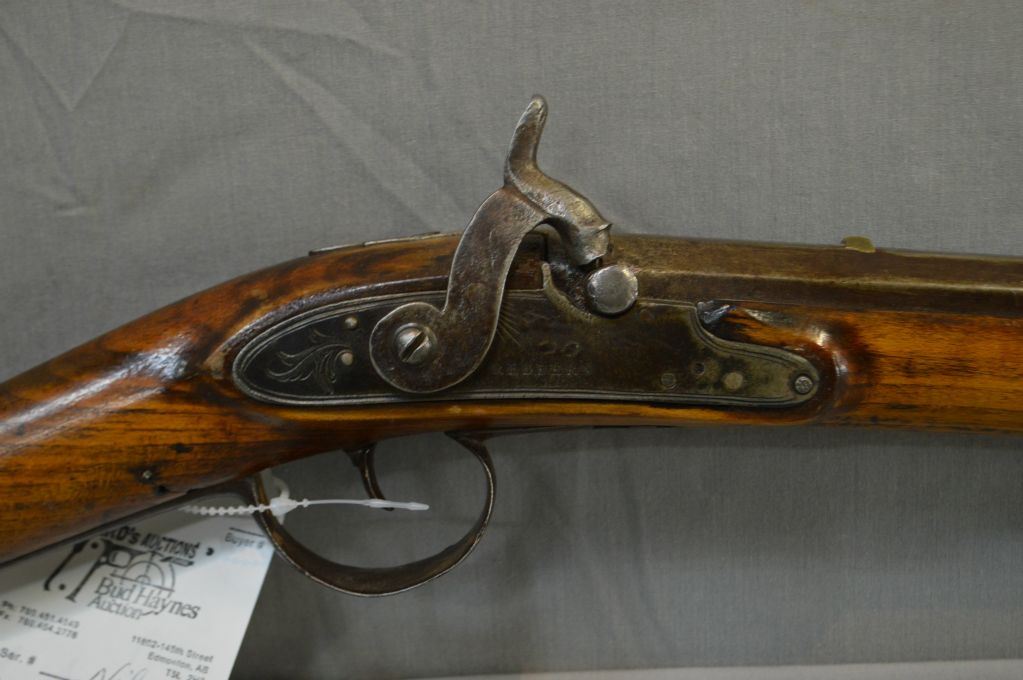 Redfern Model Trade Musket Full Wood Approx. .60 Perc Cal Single Shot Black Powder Musket w/ 39" part octagon part rnd bbl w/ two proof marks & also stamped RW [ lightly engraved lock marked Redfern, lightly engraved brass on opposite side of lock, good wood showing some dry age cracks, brass butt plate, wooden ramrod ] Ser # Nil ANTIQUE NO PAL REQ