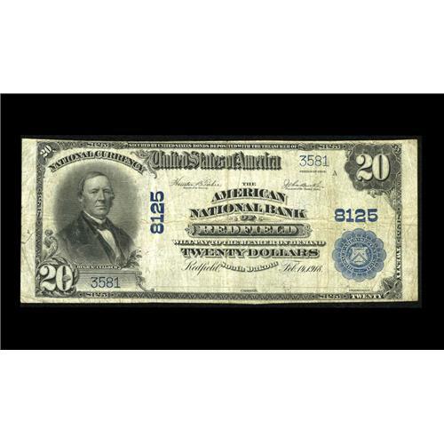 <B>Redfield, SD</B></I> - $20 1902 Plain Back Fr. 658 <B>The American NB </B></I> Ch. # 8125<BR>Once called Stennett Junction, this community was settled beginning in the 1880's and is named in honor of Joseph Barlow Redfield, a long time auditor for the Chicago and Northwestern Railroad. It is well known to sportsmen and hunters as the "Pheasant Capital of the World." This note is solid save for a couple of pinholes.