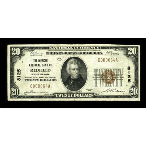 <B>Redfield, SD</B></I> - $20 1929 Ty. 1 <B>The American NB</B></I> Ch. # 8125<BR> This is the first reported $20 from this bank and carries a classic coin hoard name. Nicely margined with bright surfaces, expect this piece to be highly contested as it is perhaps the finest example extant from here.<B> Very Fine+.<BR></B></I><I>From The Walla Walla Collection</B></I><BR><BR><b>Shipping:</b> Coins & Currency (<a target="_blank" href="http://www.heritageauctions.com/common/shipping.php">view shipping information</a>)