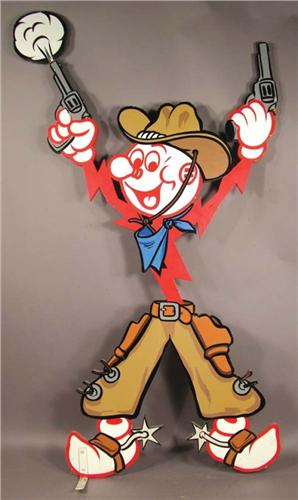 Redi Killowatt in Cowboy Outfit. Wood Cutout, 2 sided. Excellent Condition. 27 x 48 x 3/4 inches.