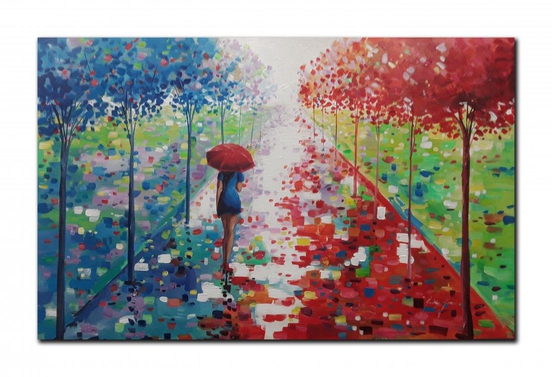 Redis Ranxa's "Rainy Day Stroll" original acrylic painting on canvas. An amazing piece of a woman in a blue dress holding a red umbrella. The painting makes it appear as if it was raining, and the trees have been made blue and red in an abstract style. 36" x 48"