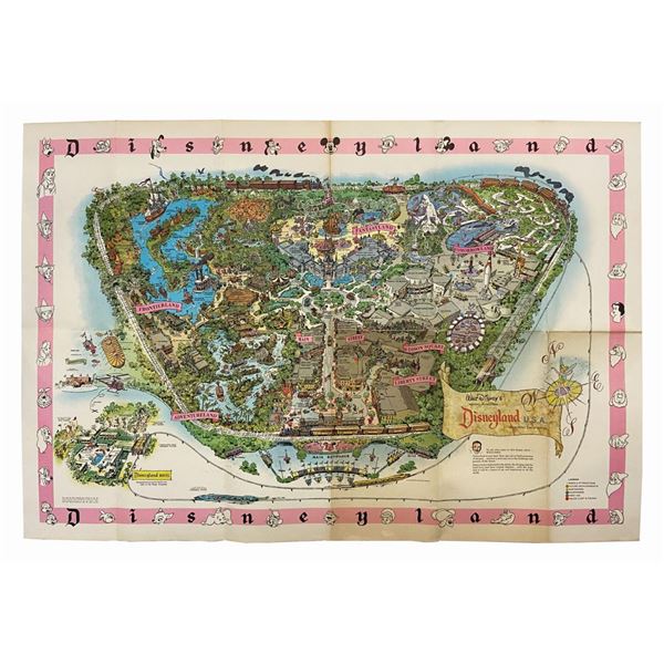 (Disneyland, 1961) A large souvenir map of Disneyland from 1961. This version of the Sam McKim designed souvenir Disneyland map features a pink border
