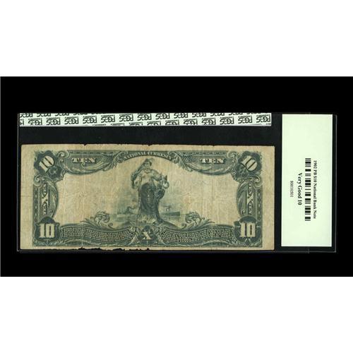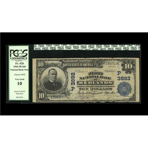 <B>Redlands, CA</B></I> - $10 1902 Plain Back Fr. 626 <B>The First NB</B></I> Ch. # (P)3892<BR>Large notes only from this Redlands bank, which, like most examples known from this well collected institution, has a couple of minor problems. The bottom margin is a bit frayed, and there are a couple of splits in the top margin. PCGS has graded this note as <B>Very Good 10,</B></I> which seems a bit harsh to us, as the note otherwise appears to be Fine or even better. Both the High Desert and the Horwedel examples were low grade and each realized a four figure price, making this example likely worth...