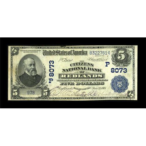 <B>Redlands, CA</B></I> - $5 1902 Date Back Fr. 591 <B>The Citizens NB</B></I> Ch. # (P)8073<BR> A very rare San Bernardino County bank with just six notes making up the entire census. In recent years, notes from here have been available only when great California collections have been dispersed, with the last offerings in Colver (1999) and Horwedel (2004), where an example quite a bit lower in grade than this realized $4370. <B>Extremely Fine, </B></I>with a small tip out of the top margin and just a bit of light foxing in the margins. <BR><I>From The Kansas City Collection.</B></I><BR><BR><b>Shipping:</b> Coins & Currency (<a target="_blank" href="http://www.heritageauctions.com/common/shipping.php">view shipping information</a>)