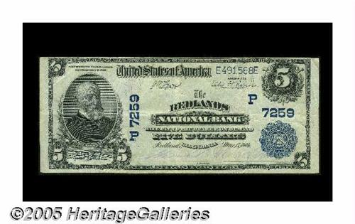 <B>Redlands, CA</B></I> - $5 1902 Plain Back Fr. 598 <B>The Redlands NB</B></I> Ch. # (P)7259<BR>The Kelly census shows just five examples extant from this rare Redlands bank, with this newly discovered specimen making note number six. It's easily the nicest of the group, grading considerably higher than the Horwedel collection example which realized $2,990 last September. With only five offerings in the past six decades this is a very tough bank to acquire, and the opportunity to add a note of this caliber on a rare San Bernardino County bank is hardly an everyday occurrence. <B>Very Fine.</B></I>