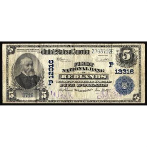 Redlands, CA. $5 1902 Plain Back. Fr. 609. FNB. Charter #(P)12316. Fine.