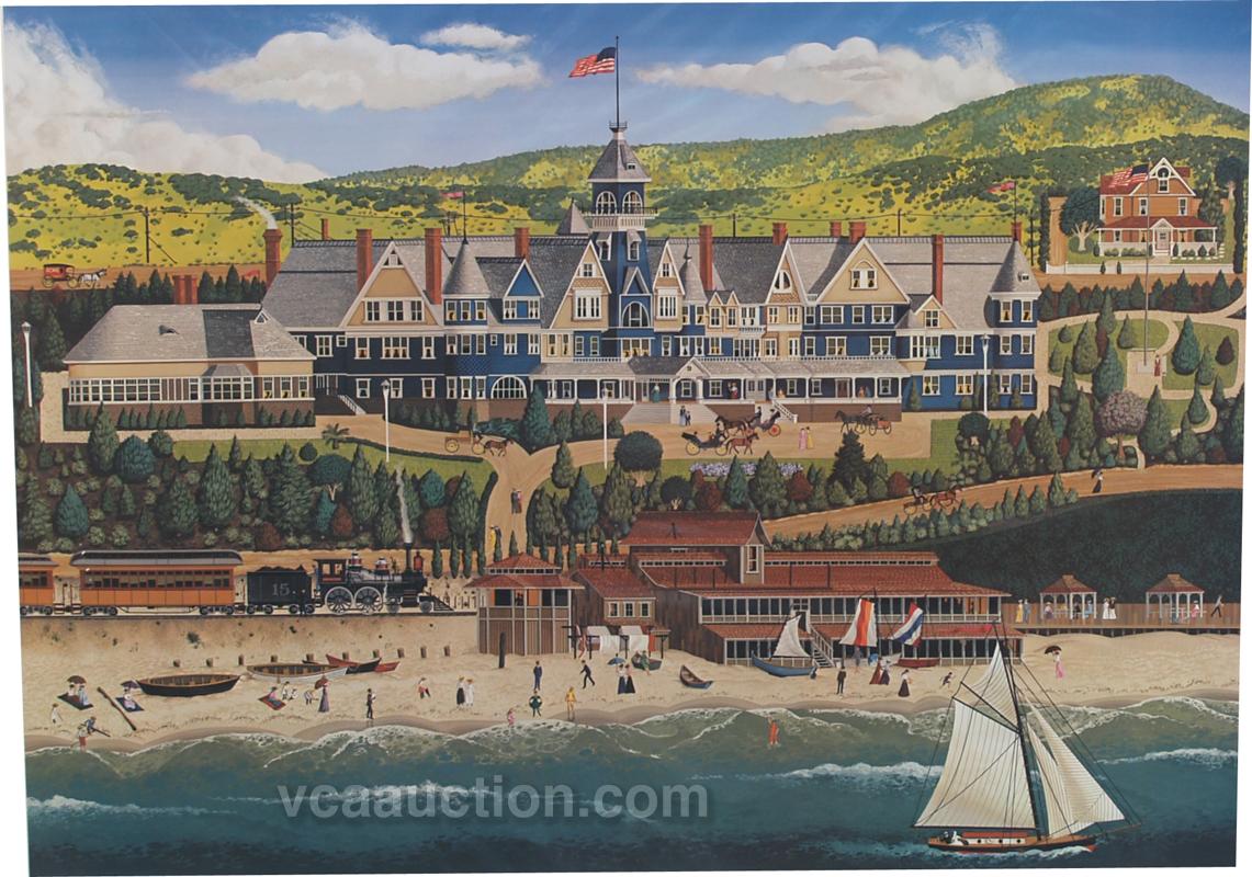 "Redondo Beach Hotel" Offset Lithography Print by Herb Fillmore (1/22/24 - 1/27/99) signed & numbered by the estate 23/750 w/ certificate of authenticity. Each original painting took the artist thousands of hours of research & execution - 33" x 26"