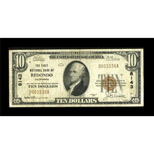 <B>Redondo, CA</B></I> - $10 1929 Ty. 1 <B>The First NB</B></I> Ch. # 8143<BR> An attractive <B>Fine-Very Fine</B></I> specimen from this well collected beach community. There is one small margin split that is barely worthy of mention. <BR><I>From The Kansas City Collection.</B></I><BR><BR><b>Shipping:</b> Coins & Currency (<a target="_blank" href="http://www.heritageauctions.com/common/shipping.php">view shipping information</a>)