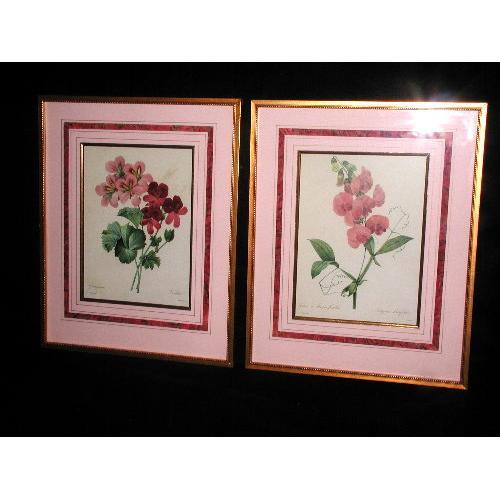 Beautiful pair of P. J. Redoute botanical prints in shades of pink and rose. The botanical names appear below either side as well as the artist and engraver as they appeared on the original plates. French matted by hand in light pink with raspberry marbleized paper and gold ruling pen. The interior liner is in antique gold wood which accents the antique gold of the small wooden frame with gold bead. A stunning pair,museum quality. Excellent condition. Measure 15.25H X 11.25W.