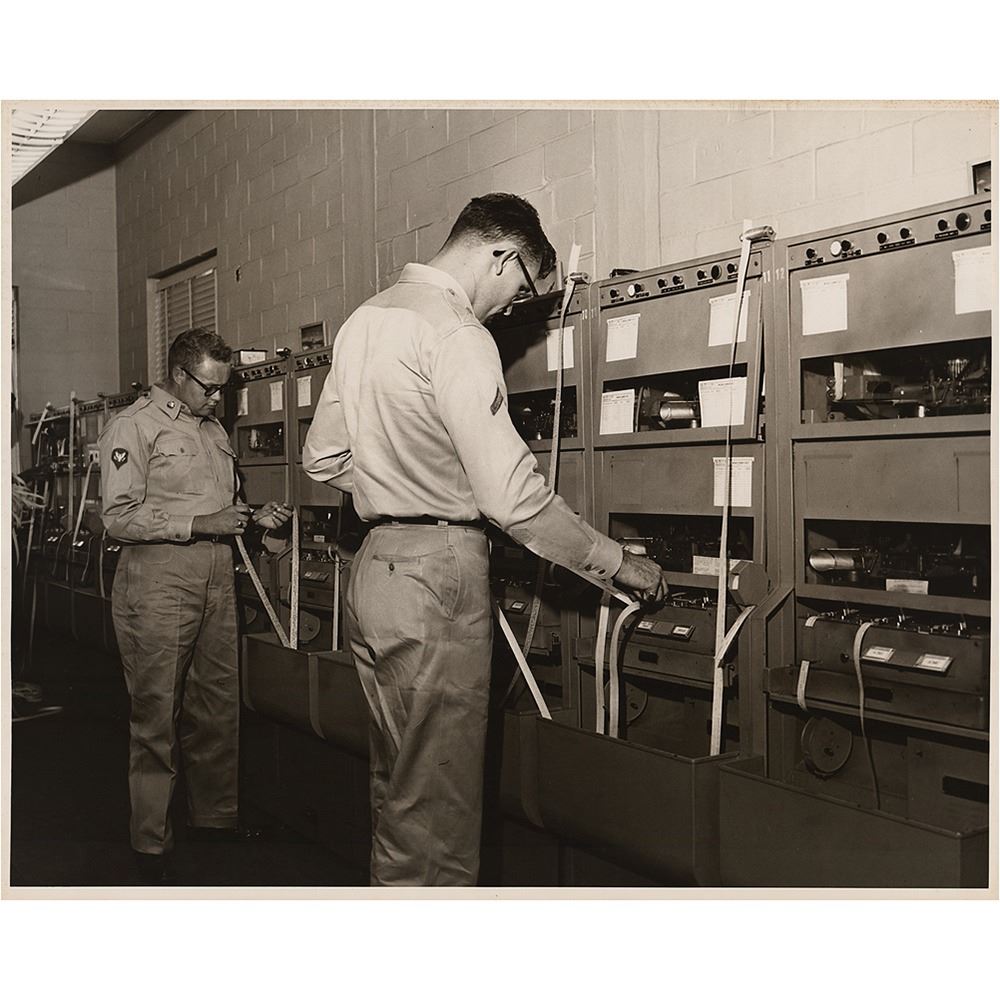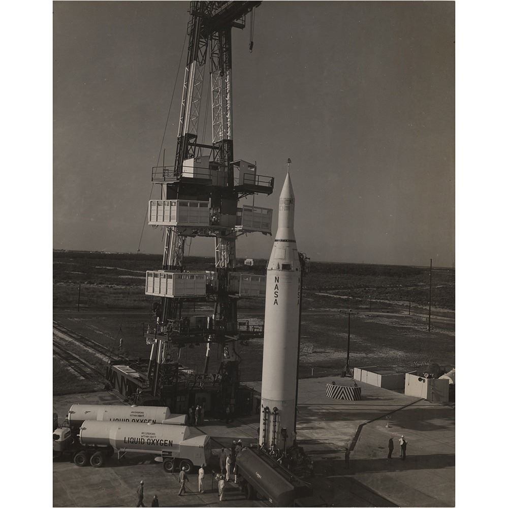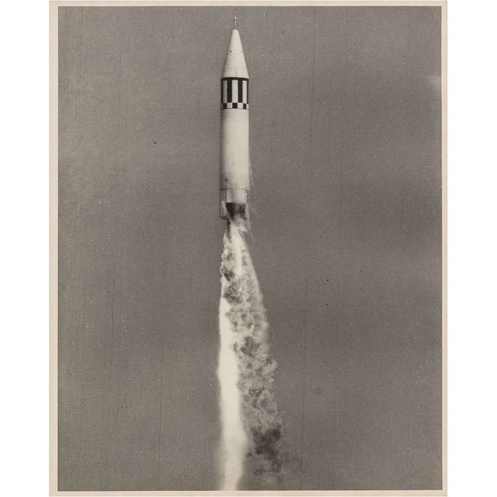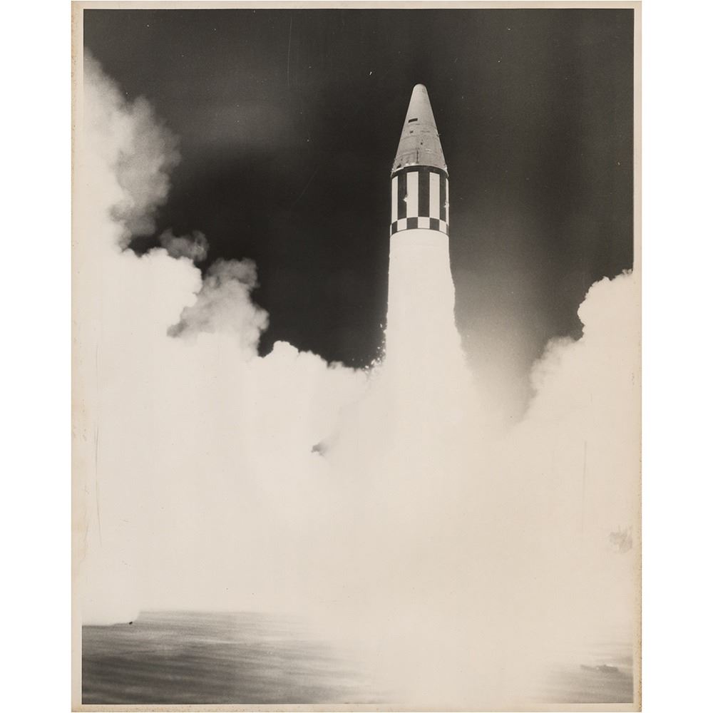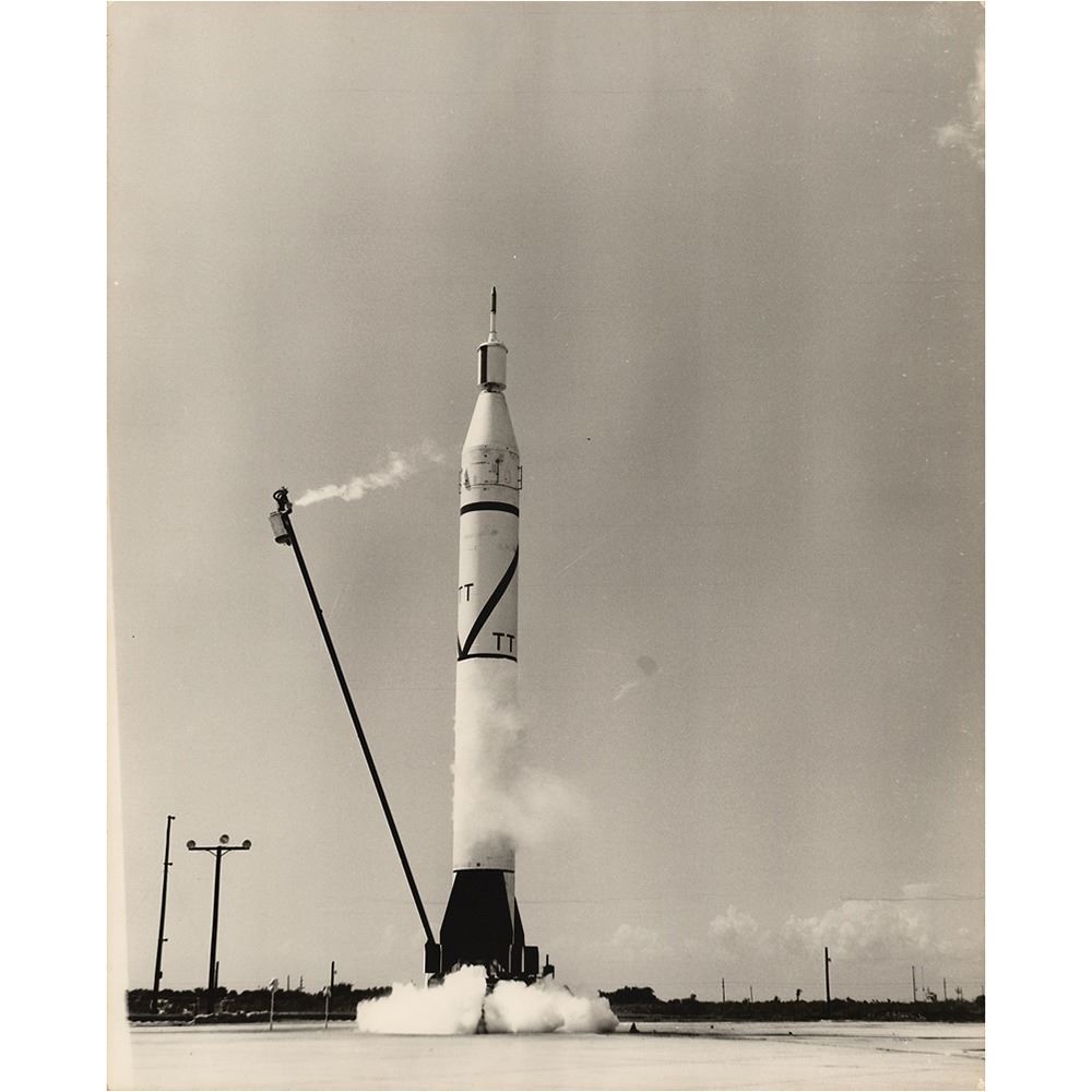 Collection of 39 vintage oversized matte-finish photographs of various members of the Redstone launch vehicle family from the 1950s, all of which are either 20 x 16 or 16 x 20, with two examples affixed to same-size hardboards. The majority of the collection features photos of Juno and Jupiter rockets during preflight checkups and launch tests, in addition to behind-the-scenes images of personnel, launch sites, and production stages, and artistic diagrams and reference photos. Includes a vintage glossy 11 x 14 silver gelatin photo of a U.S. Army rocket launch. In overall very good to fine condition, with some curling and toning to edges, and instances of scattered spotting.
