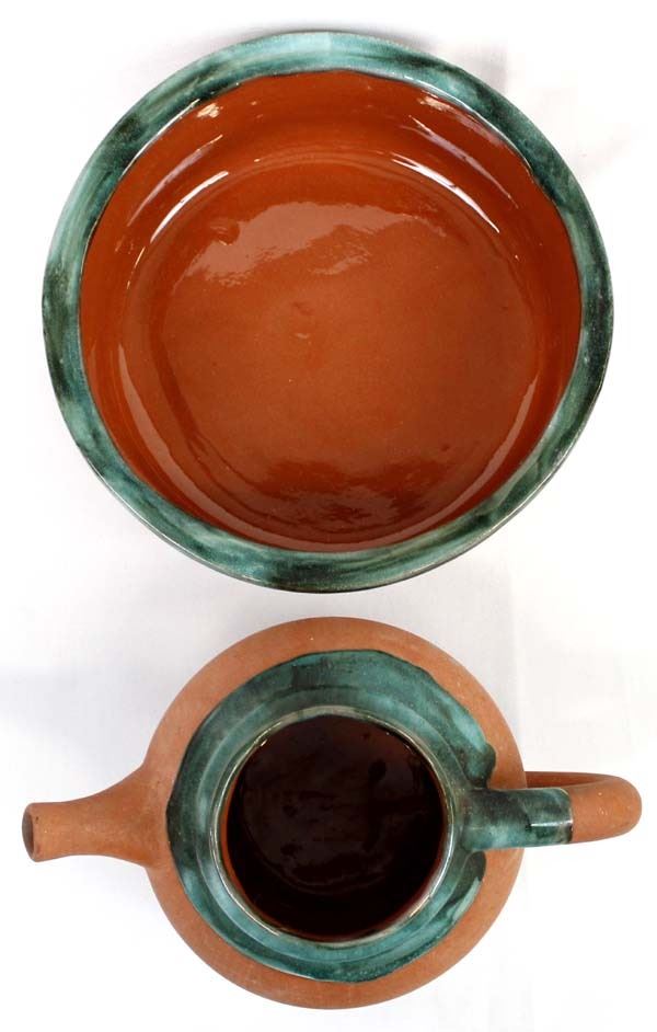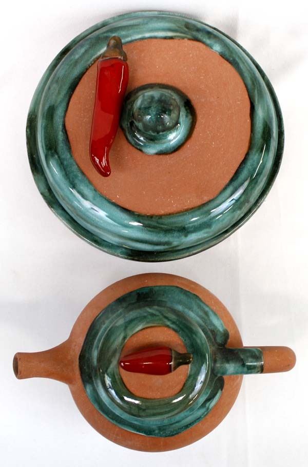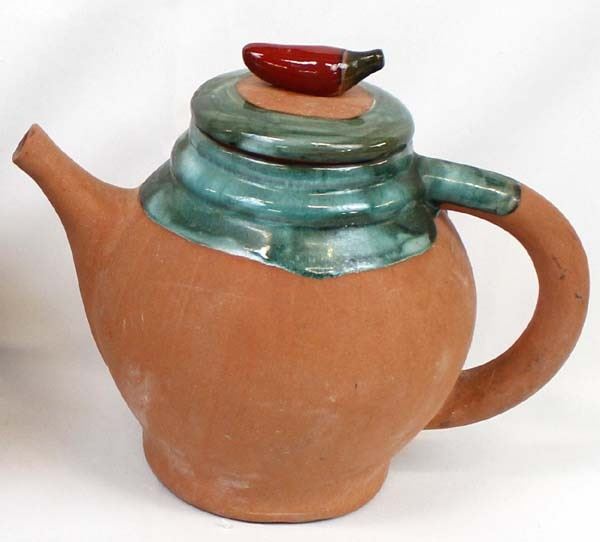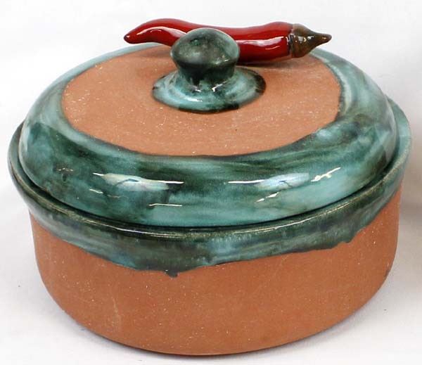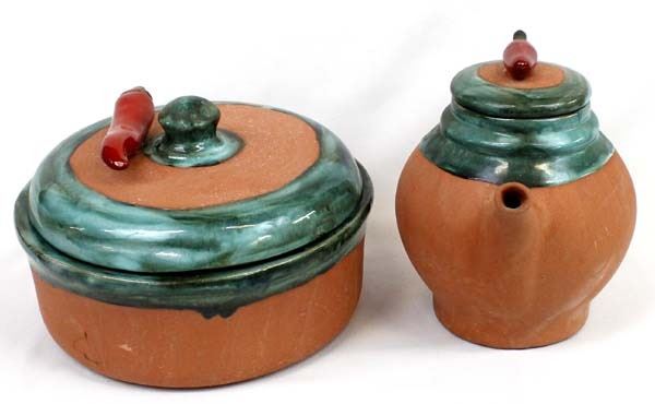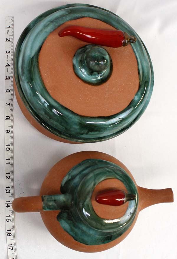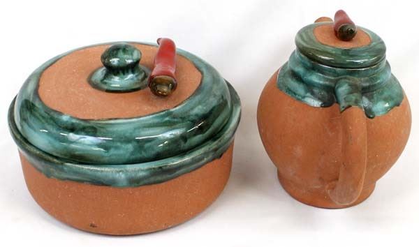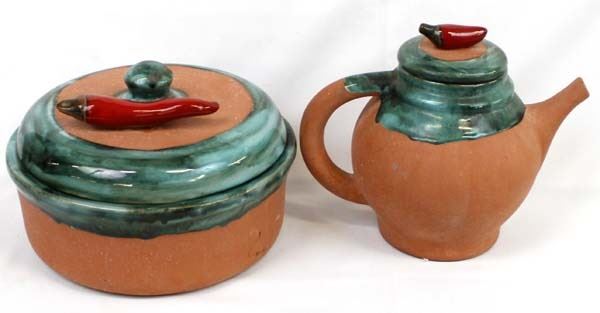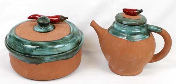 Redware Pottery Chile Pepper Pitcher and Covered Serving Dish, largest measures 7'' x 10''