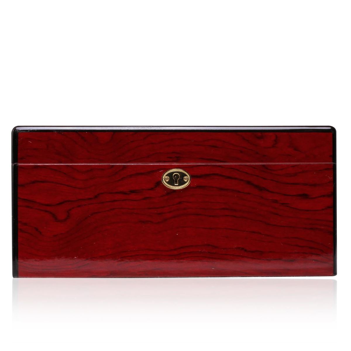 One deluxe cigar humidor featuring a glossy redwood exterior lined with premium Spanish cedar and solid brass hardware. Beautifully handcrafted to provide your cigars with the perfect environment for storage. This deluxe humidor will surely enhance your cigars smell and taste. Includes: Humidor, Hygrometer, Humidification System, Accessories, Instructions Manual. Measures 11.5 x 5.5 x 9.5 inches.