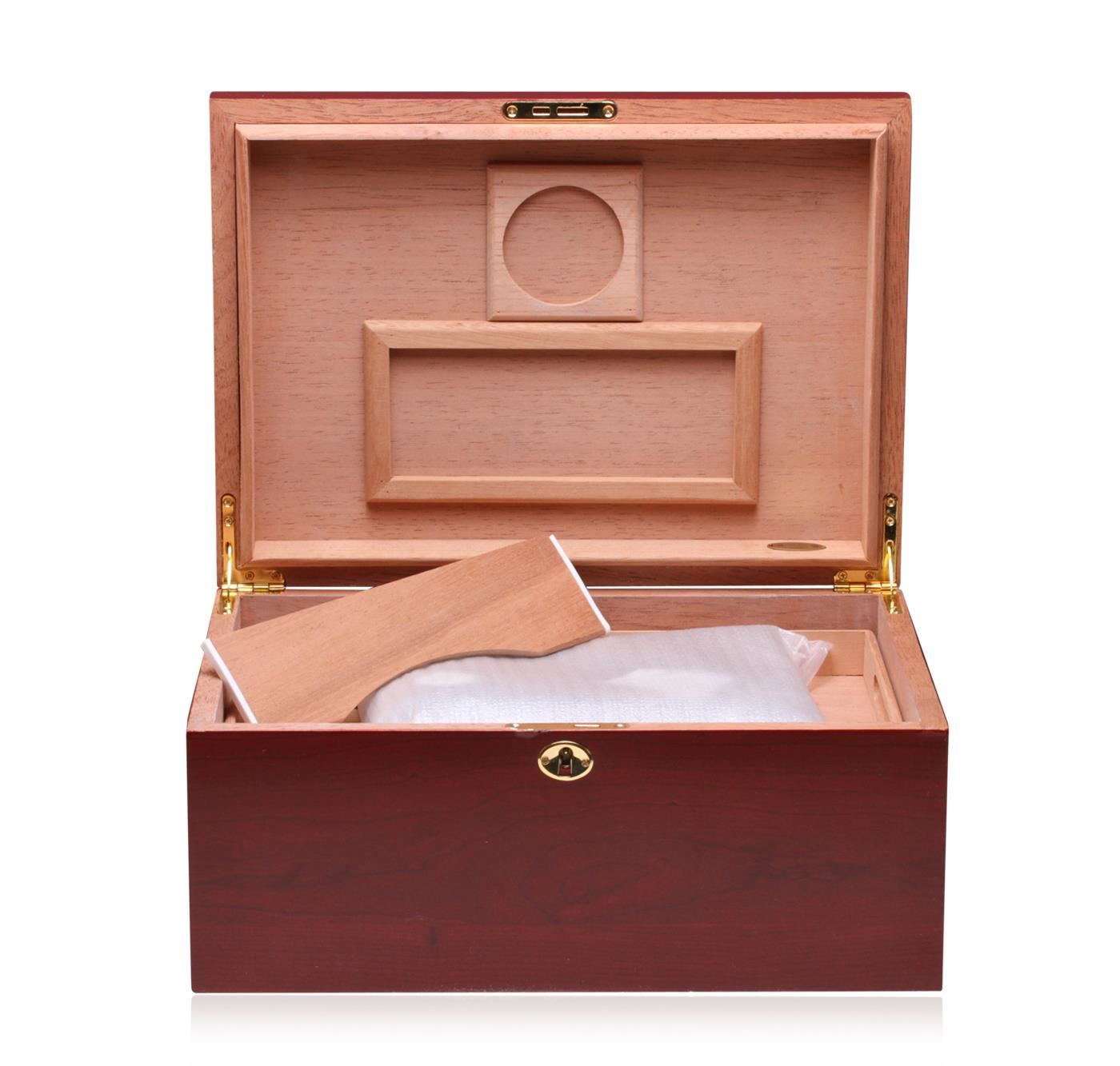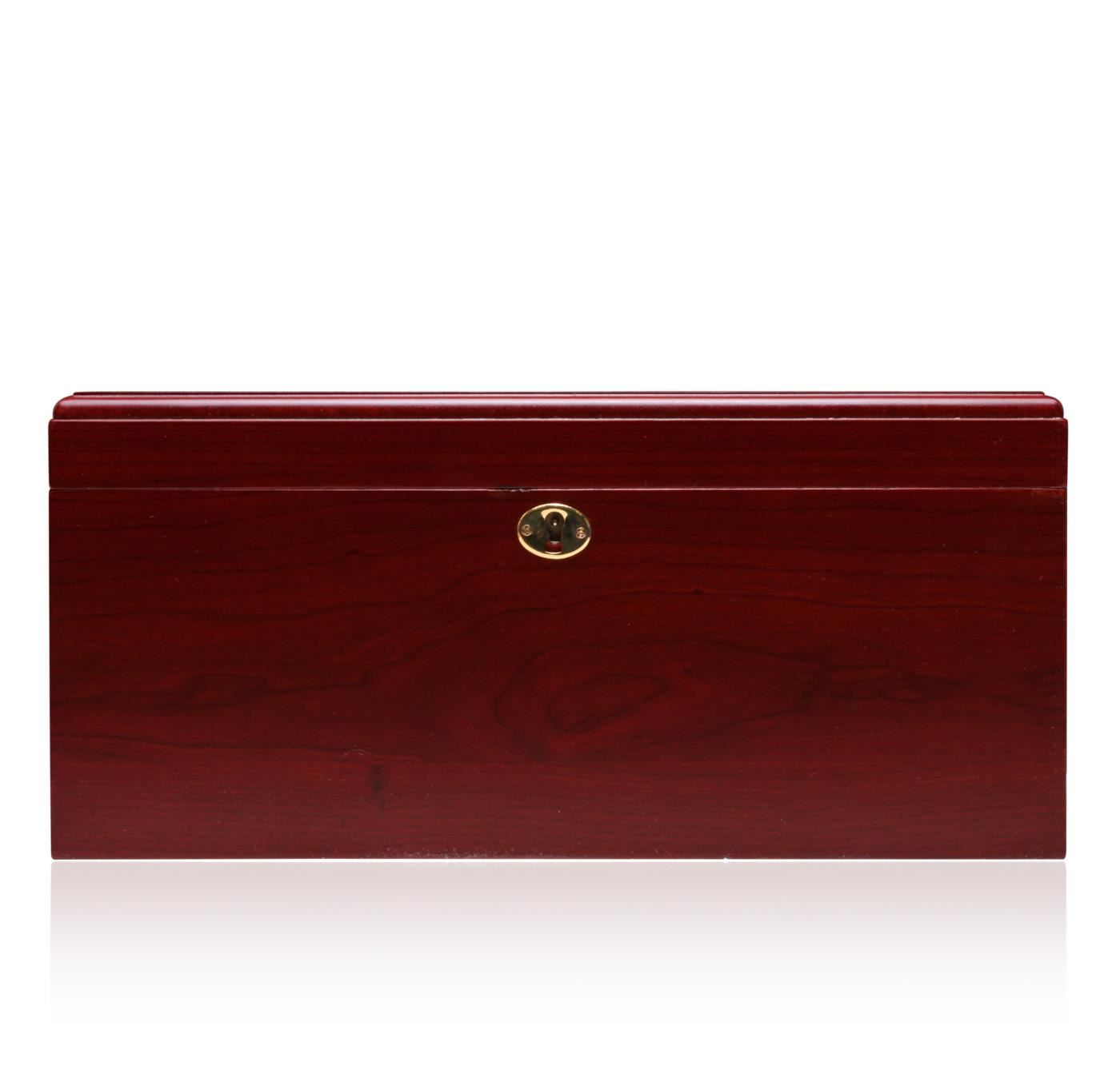 One deluxe cigar humidor featuring a glossy redwood exterior lined with premium Spanish cedar and solid brass hardware. Beautifully handcrafted to provide your cigars with the perfect environment for storage. This deluxe humidor will surely enhance your cigars smell and taste. Includes: Humidor, Hygrometer, Humidification System, Accessories, Instructions Manual. Measures 12 x 6 x 9.25 inches.