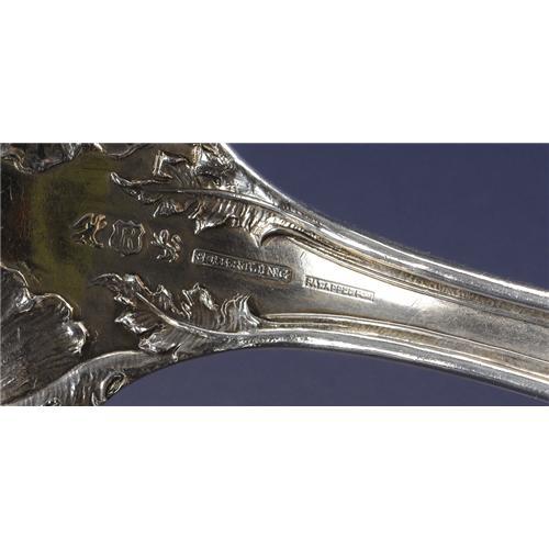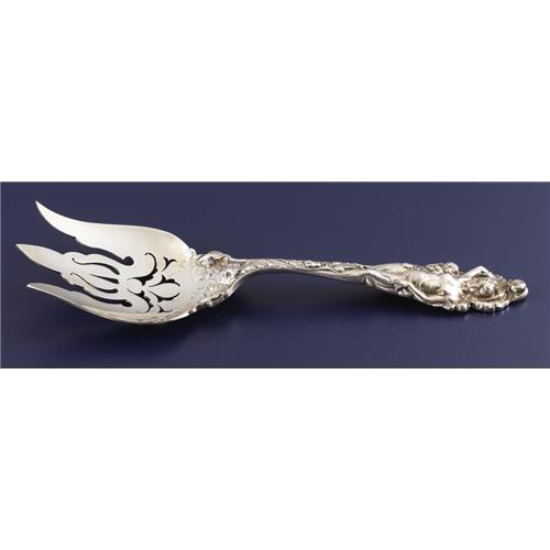 <B>An American Silver Salad Serving Fork</B></I><BR><BR>Reed & Barton, Taunton, Massachusetts<BR>Circa 1900<BR>Silver and silver gilt<BR>Marks: (eagle), <I>R,</B></I> (lion), <I>STERLING, PAT APPL'D FOR</B></I><BR>11.25 inches long<BR><BR>In the <I>Love Disarmed</B></I> pattern, with gilt tines and nine piercings. <B>Condition Report:</B> Loss to gilding.<BR><BR><b>Shipping:</b> Requires 3rd Party Shipping (<a target="_blank" href="http://www.heritageauctions.com/common/shipping.php">view shipping information</a>)