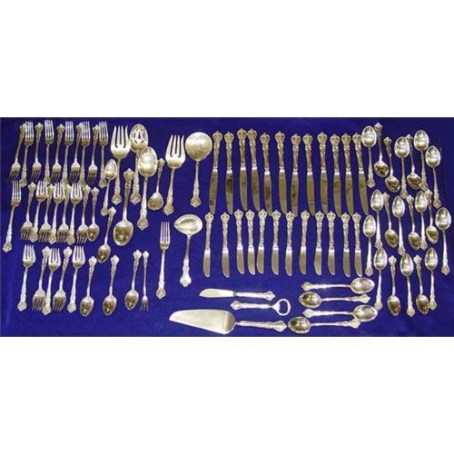 Serving Pieces: 1 Sterling Handle Master Butter Server with Stainless Blade, 1 sugar spoon, 1 pie / cake server, 1 bottle opener, 1 Olive Fork, 1 Gravy Ladle, 2 Meat Serving Forks, 1 Tomato Server, 1 Pierced Tablespoon, 2 Large Serving Spoons.