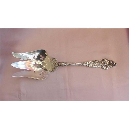 Gorgeous large and heavy Reed & Barton sterling serving fork in the coveted Les Six Fleurs pattern, circa 1901. This great pierced serving fork measures 10" long and 3" wide (at widest). It features high relief flowers streaming up the entire handle. There is an early Reed & Barton mark - an "R" with a lion on one side and bird on the other. Also marked "Sterling". Weighs 5 1/2 ounces! Excellent condition.