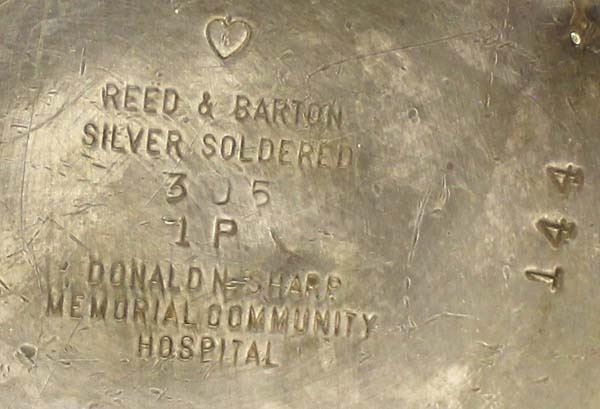 Arrington Estate: Reed & Barton Silver Soldered Pitcher, measures 6'' x 6'', bottom reads ''Donald N. Sharp Memorial Community Hospital'', this piece is heavy, marked #144
