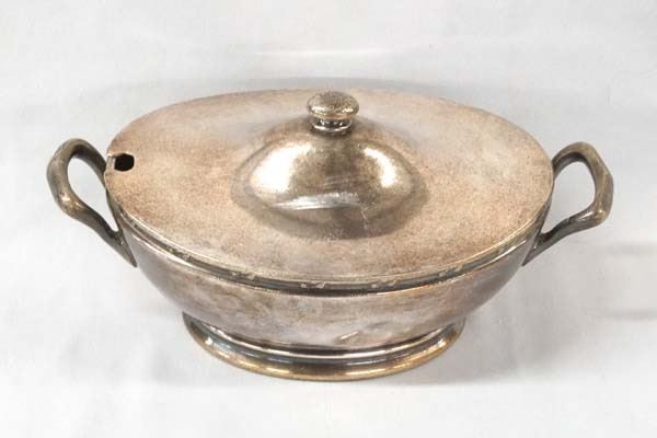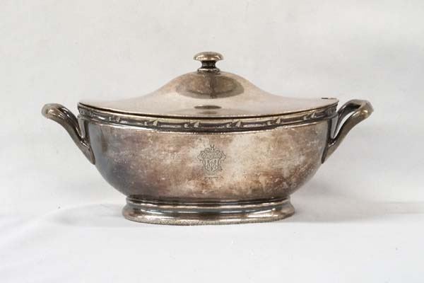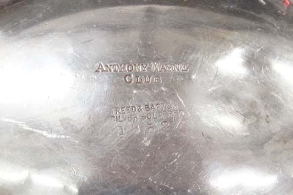 Reed & Barton Silver Soldered Serving Dish, hallmarked, #1352 1/2 4, measures 3.5'' x 6'' x 10'' and stamped Anthony Wayne Club, has dent in one side of dish