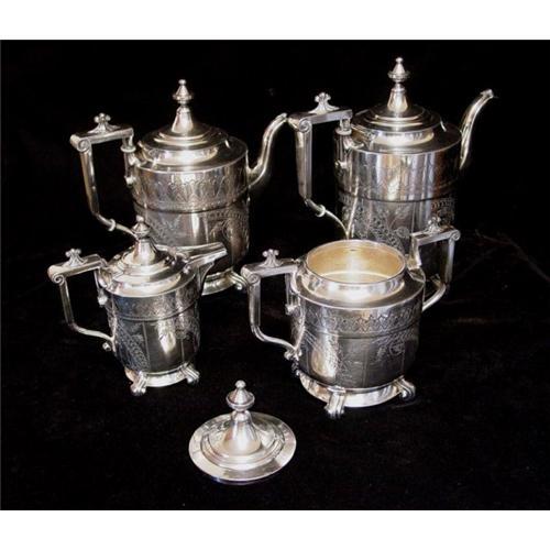 Beautiful Reed & Barton tea set composed of four pieces: tea pot, coffee pot, creamer and lidded sugar bowl. It is marked on the underside: Manufactured by Reed & Barton. It's style number is 2689 and corresponds to a silver plated hard white metal tea set produced at the Taunton, MA factory between 1867 and about 1885. The mark shown that looks like a globe with wings atop of it, is the white metal trade mark used by Reed & Barton during this period. In very good used condition as shown. Please ask questions, request additional photos and shipping costs before buying.
