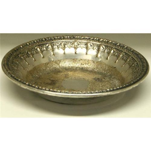 This is a unique, gleaming, silver plated bowl by the Reed & Barton silver company. This is different from many other bowls you see. This decorated with flower engravings and other beautiful ornamental designs around the edge of the bowl. This piece is engraved underneath with the company name, ?Reed & Barton? and an arrow that shows the year 1957. It measures 1? high and 6.25? in diameter and weighs 4 oz.