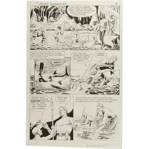 <B>Reed Crandall - Flash Gordon #11, page 4 Original Art (King, 1967).</B></I> Flash Gordon nearly loses his foot in this action-packed page from "Dream Devils of the Volcanic World." Reed Crandall excelled at figure drawing and this page showcases his talent for heroic fantasy. Crandall studied the work of illustrators such as Howard Pyle, N. C. Wyeth, and James Montgomery Flagg and he brought a new standard of draftsmanship to the comic book field. The image area of the page is 10" x 15", and the art is in Excellent condition.<BR><BR><b>Shipping:</b> Flat Material, Small (<a target="_blank" href="http://www.heritageauctions.com/common/shipping.php">view shipping information</a>)