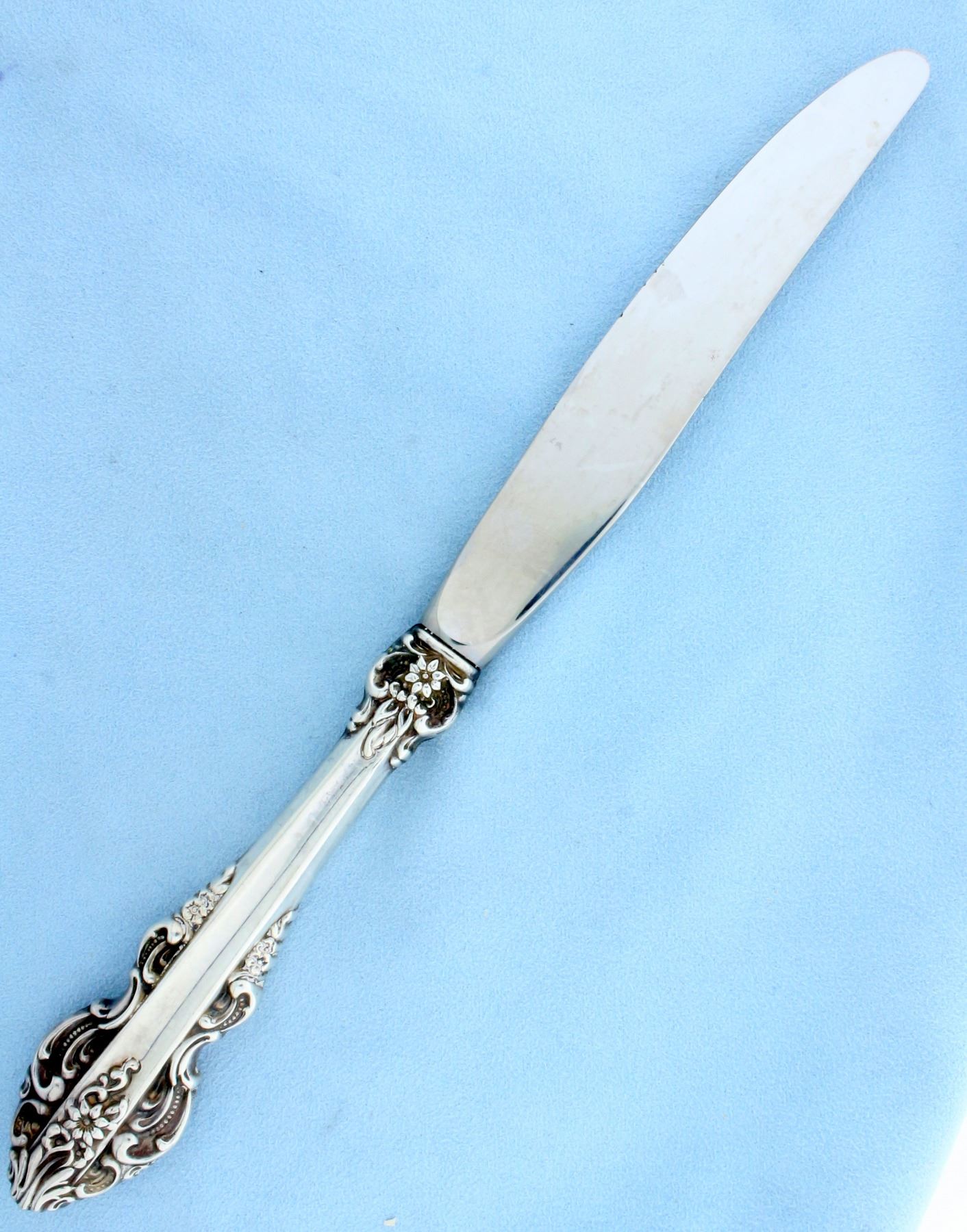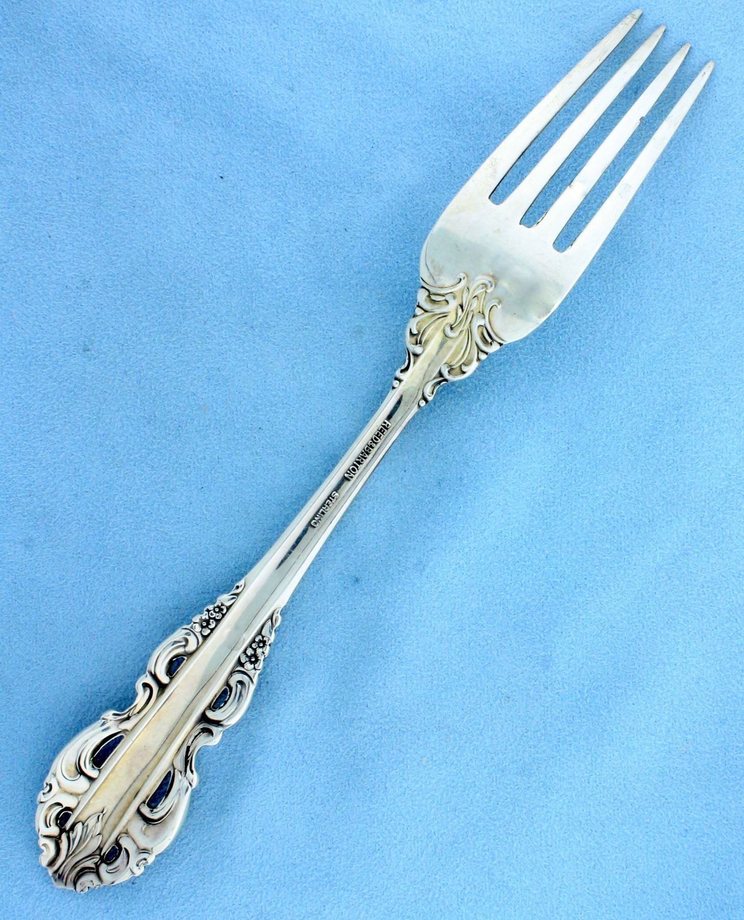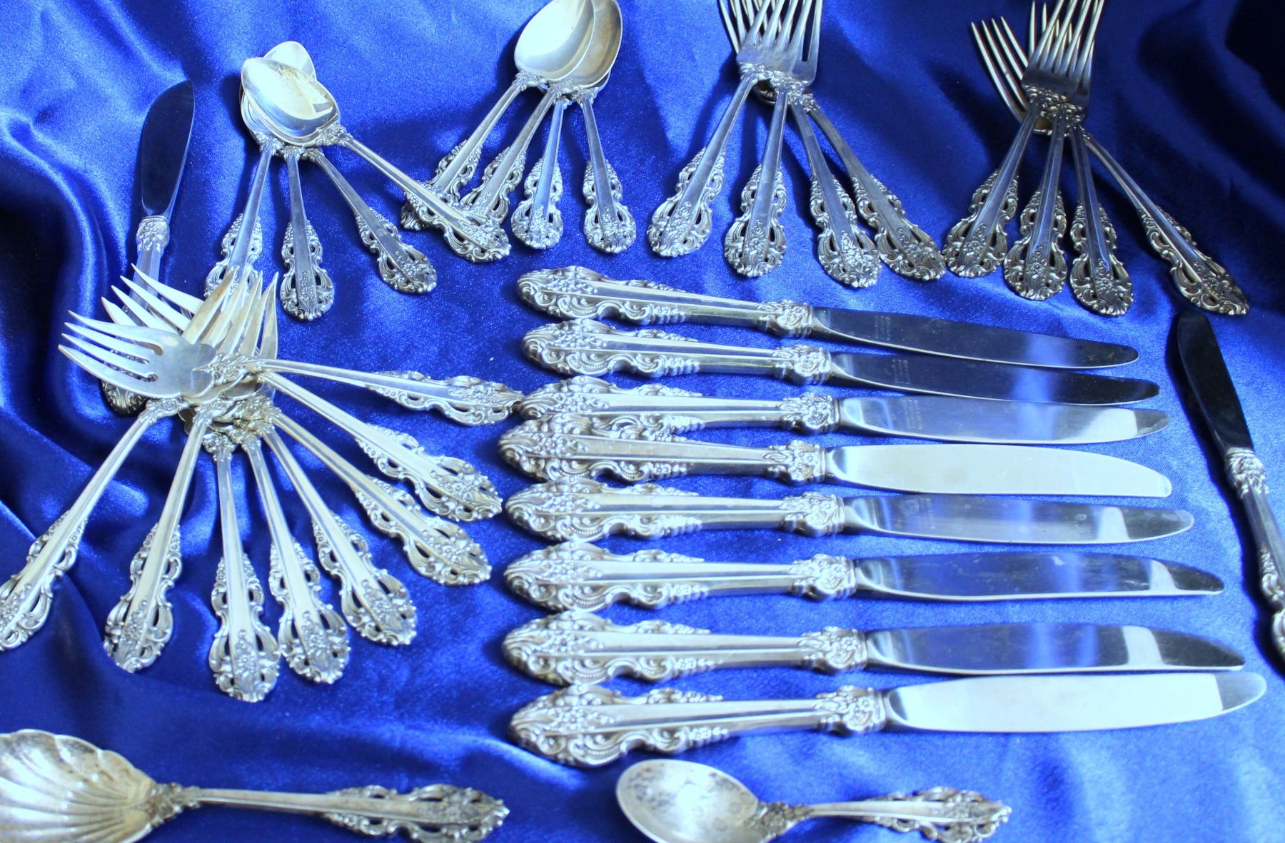 In sterling silver, NOT plated. In excellent condition, no monograms. Sterling silverware set includes: 8 forks - 7.5 inches, 8 salad forks - 6.5 inches, 8 knives - HH - 9.25 inches, 8 teaspoons - 6 inches, 1 sugar shell spoon - 6.25 inches, 1 butter spreader - HH - 6.625 inches, 1 master butter knife - HH - 7.25 inches, 1 spoon - 4.5 inches. 1,929.6g.