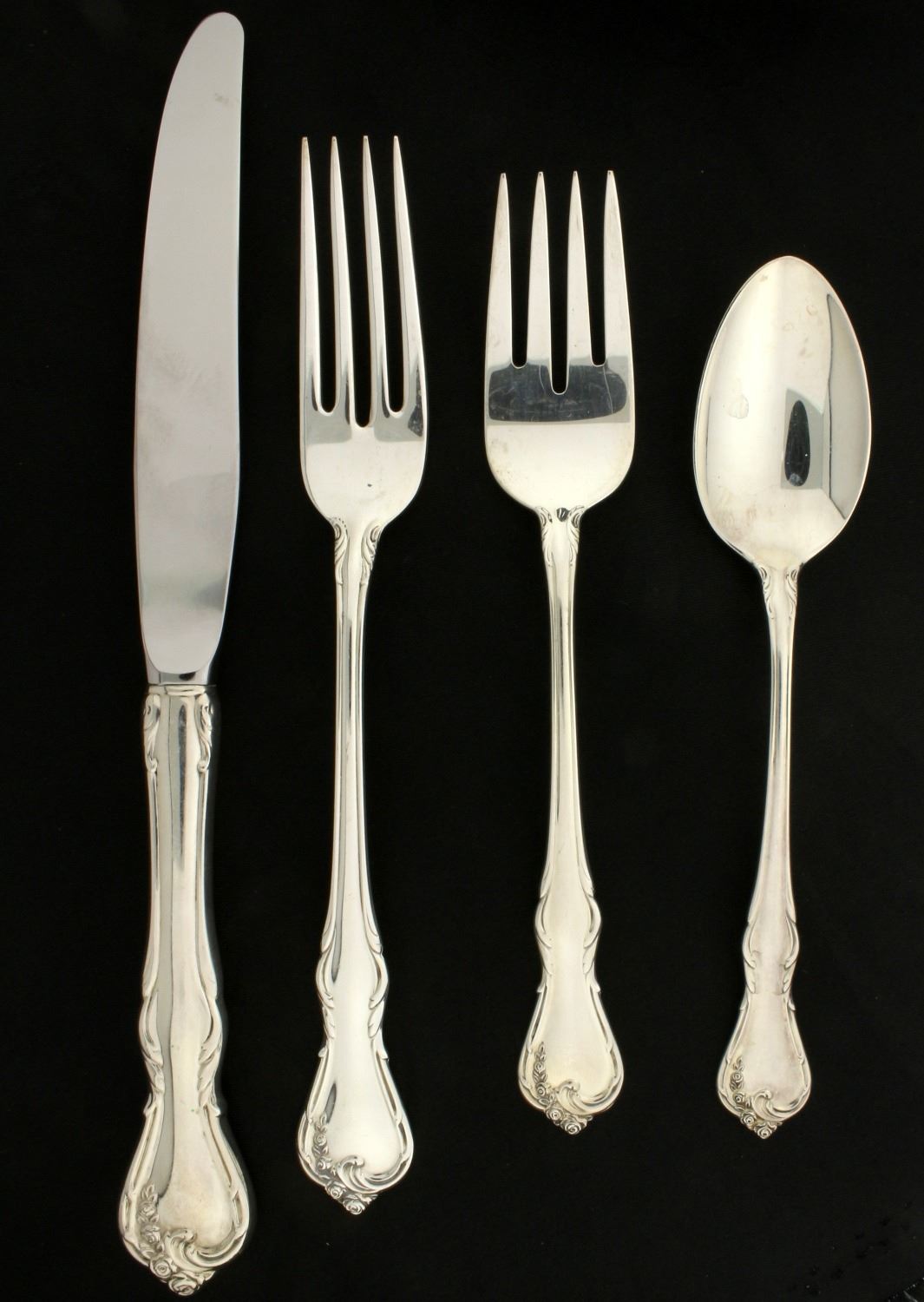 Set includes: 12- 7 3/8" forks; 12- 6 1/2" salad forks;12- 6" teaspoons; 12- 9 1/4" steak knives- hallow handle; 8- 6 3/8" modern hollow handle butter spreaders; 1- 8 5/8" Tablespoon serving spoon; 1- 6 3/4" Solid Gravy Ladle; 1- Wooden Box that is tarnish resistant for silverware. 2,813g.