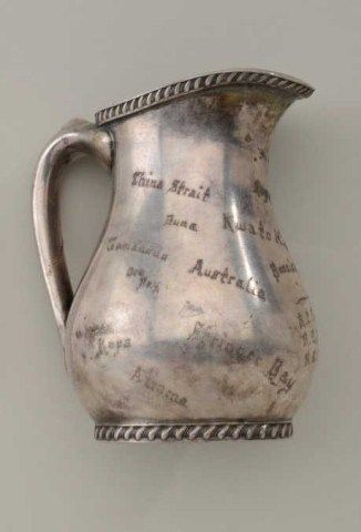 Reed and Barton silver soldered, pitcher, inscribed as WWII-Cruise memento showing U.S. Navy Seabees, anchor, and locations engraved of ports or battles. Names A.C. Minaix-R.C. Cole-R.C. Frost-Austrailia, Ahoma, Oro Bay,China Strait, Kwato Mission, Townsville, Waga Waga, and others with last Milne Bay New Guinera 1945 on handle. Should be researched. Est.:$200-$400.