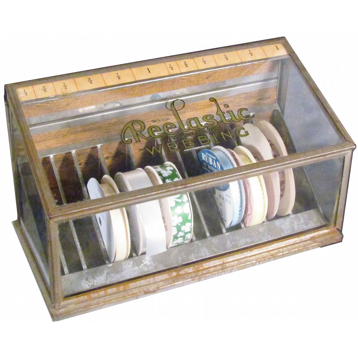Reelastic Webbing Store Display Case. Glass and nickel. Original decal on lid, good condition. 12 1/2 X 7 X 6 inches.