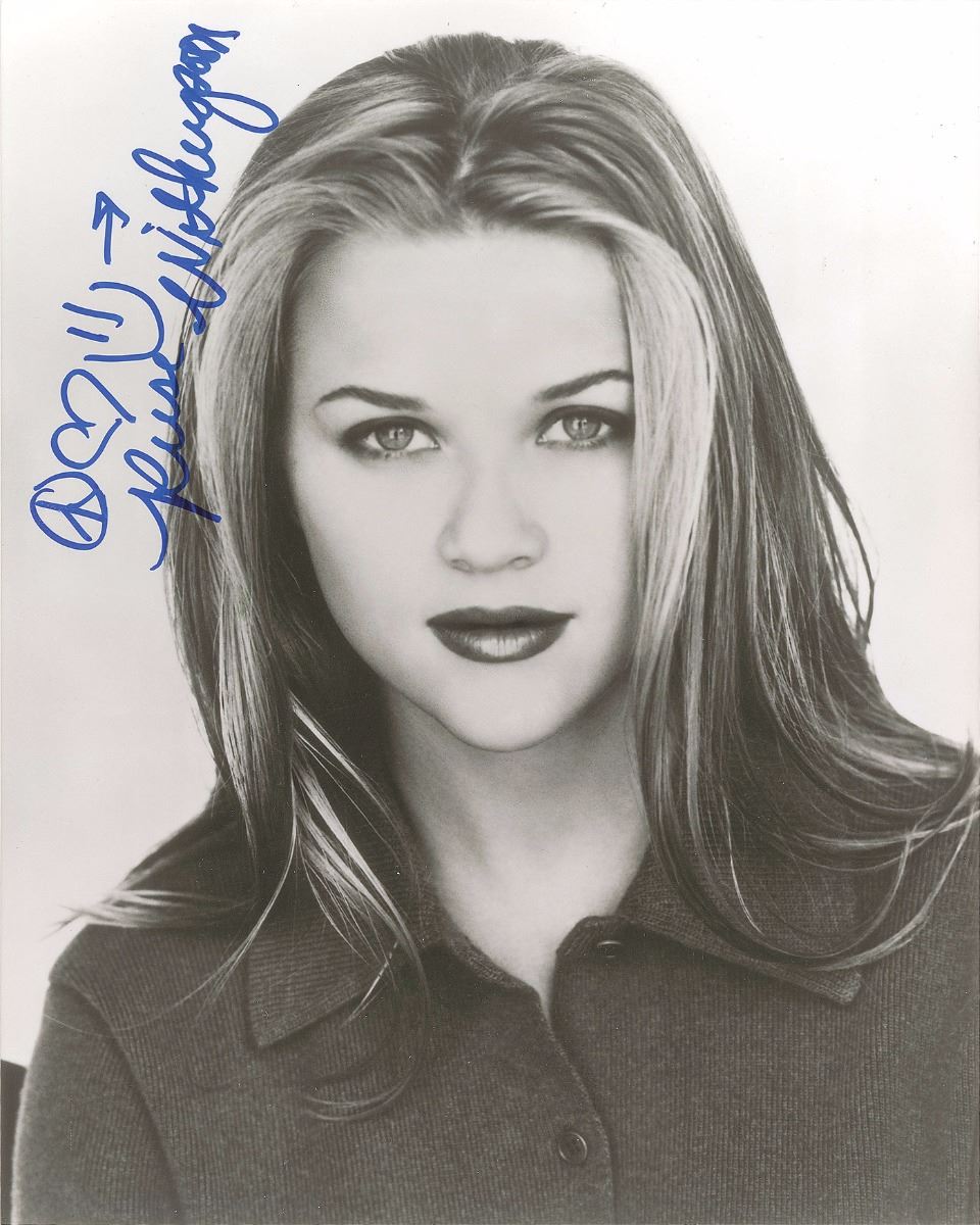 Satin-finish 8 x 10 publicity portrait of the Oscar-winning actress at a young age, signed in blue felt tip by Witherspoon, who adds a peace sign, heart, and smiley face. In fine condition. From the Harvey and Rhoda Kuflik Collection. Pre-certified PSA/DNA.
