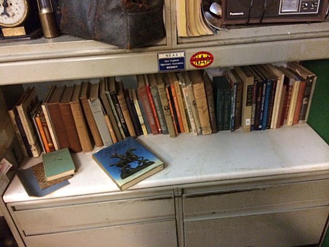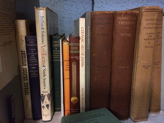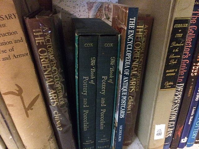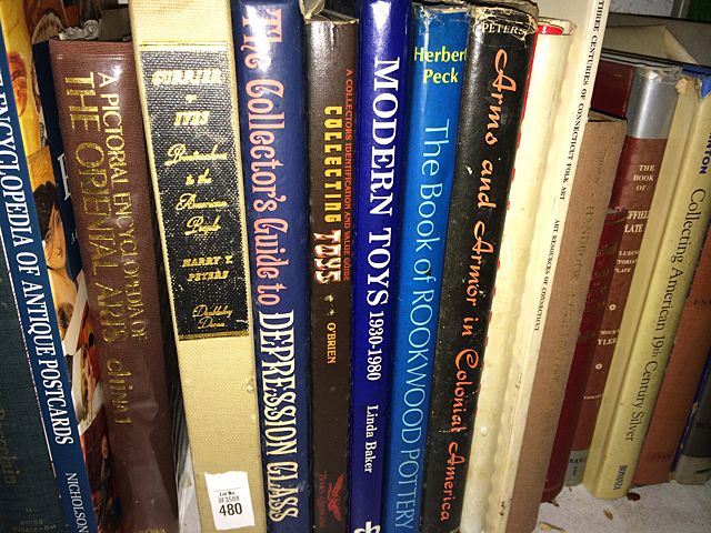A very nice collection of reference books (approx. 59) that were the personal books used by Arthur "Artie" Shaw in his business. Books include "Animals in Bronze", "Field Guide to Rocks and Minerals", Indian and Eskimo Artifacts", American Glass, American Antique Furniture, Furnitrue Treasury by Nutting, Ceramic Art of Japan, The book of Bottle Collecting, Samplers and Stitches, Old ENglish Antiques, Gem Testing, Auction Prices of American Artists, Dictionary of Marks/Pottery and Porcelain, Top of the Line Fishing Collectibles, American Blown Glass, Folk Art of Rural Pennsylvania, Indian Axes, John F. Kennedy, Scrmshaw Collector, The Book of Bussalo Pottery, By Shaker HAnds, Shaker Furniture, INdian Artifacts, Euroean and American ARms, A Glossary of the Construction and Decoration and Use of Arms and Armore, The Oriental Arts, The Book of Pottery and Porcelain, Encyclopedia of Antique Postcards, Currier and Ives, The Collector's Guide to Depression Glass, Colecting Toys, Modern Toys, The Book of Tookwood Pottery, Arms and Armor in Colonial American, American Pewter, Collecting American 19th Cetnury Silver, American Silver, Pewter, and Silver Plate, etc. A fantastic collection of reference books!!! These items may be picked up in Torrington, CT. Appointment time will be scheduled after auction date.