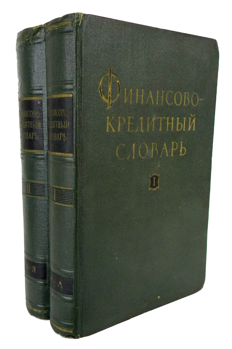 Diachenko, V.P. [editor]. ФИНАНСОВО-КРЕДИТНЫЙ СЛОВАРЬ. Moscow: Gosfinizdat, 1961. Two volumes. Tall 8vo, original matching green cloth, gilt. 663, (1); 688 pages; addenda slips tipped in to both volumes. Some wear to spines, but still sound. Very good or better. An important Soviet financial glossary, rarely offered, with notable numismatic content. Compiled by economists and numismatists, its coverage of the history of Soviet monetary circulation is considered more authoritative than similar publications by the Hermitage or State Historical Museum.