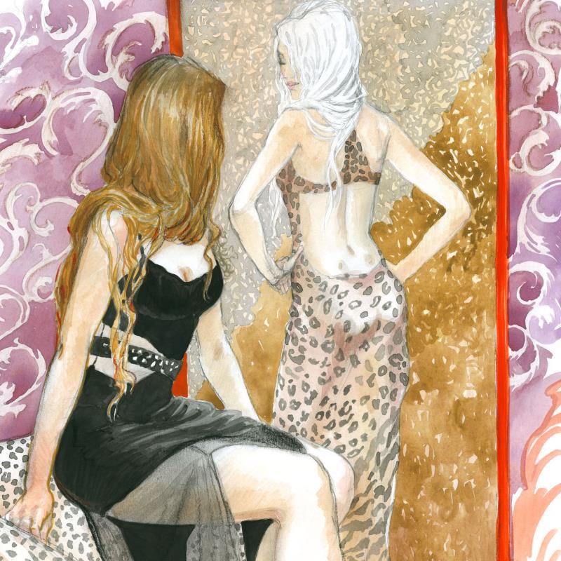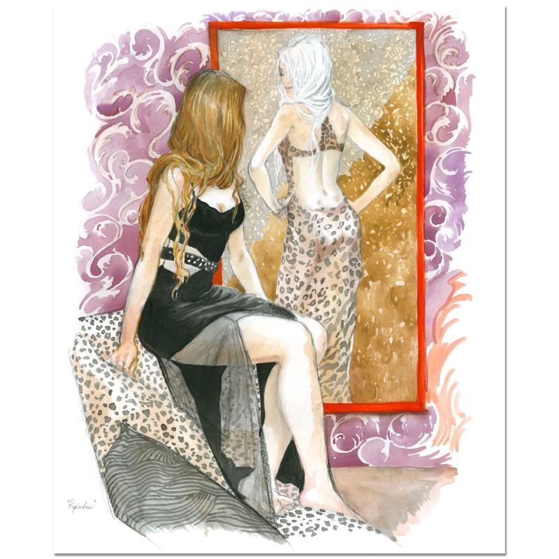 "Reflection" is an original painting, mixed media (ink and gouache) on vellum art paper, by Lena Sotskova. This piece is hand signed by the artist, hand titled, and accompanied by a certificate of authenticity. Measures approximately 17" x 14".
