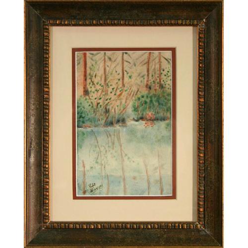 Robert Widmeyer?s original watercolor entitled, ?Reflections? illustrates a quiet landscape along the shore of a placid lake or pond. Widmeyer employed the use of the wet-on-wet technique to create a soft, hazy. When using the wet on wet technique the artist saturates the paper with water and applies wet pigment allowing the colors to bleed outward from the point of application, often creating a dreamy effect. The influence of the impressionist masters is also apparent in Widmeyer?s use of small brushstrokes to create the foliage along the water?s edge. The reflection in the water takes on an almost abstract feel as the composition?s top and bottom become somewhat ambiguous to the eye. The subdued color palette reinforces the dream-like atmosphere of the composition. The artist?s signature can be seen in the lower left corner reading, ?Robt. Widmeyer.? The piece has been double matted in a deep rust bottom mat that compliments the neutral browns of the trees and a cream top mat. The unique matting and framing presentation of this piece was individually selected and created by Le Chateau?s renowned master framer, Jeanette Shoenrock, and bears her signature on the back. This charming painting is handsomely mounted in a brown and gold distressed wood frame which reinforces the naturalistic theme and brings the measurements of the piece to 11 ½?x 14 ½.? This is truly an intriguing and affordable original painting that would be a wonderful addition to any collection of landscape ...