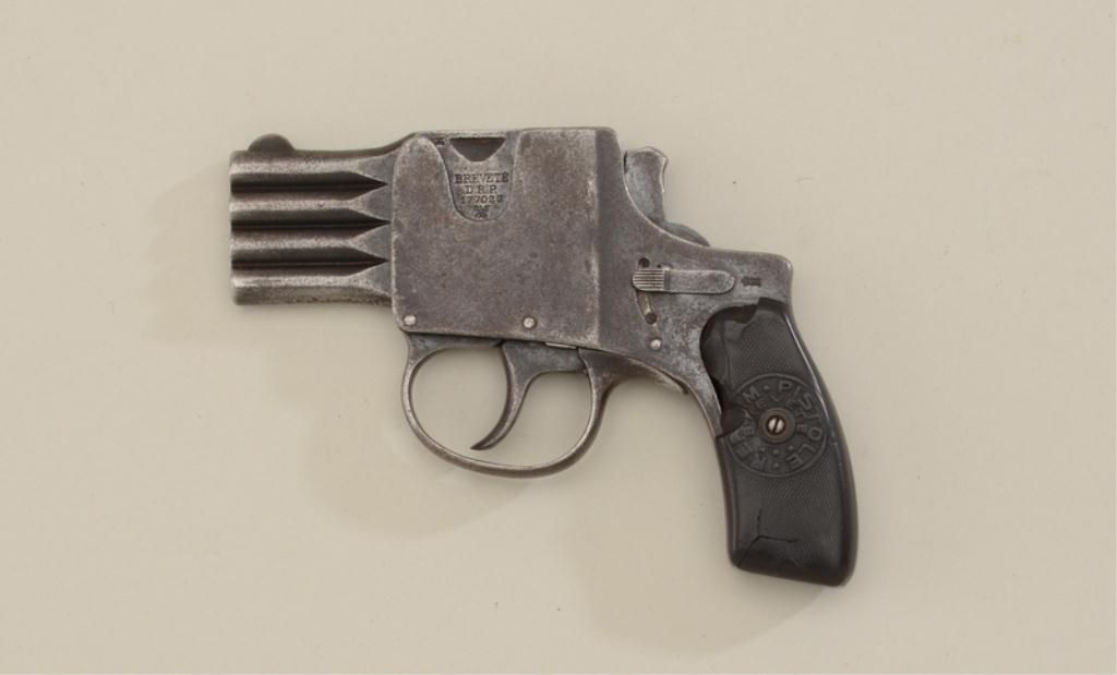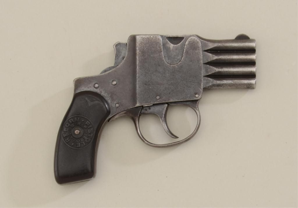 Reform .25 cal, 4 Shot Bar-Pistol Double action only, blue finish composite grips with logo. Serial #3996. Fair to good condition, action working, patina finish with some blue. Left grip cracked and damaged, rightgrip worn but good. Made about 1906. Est.; $350-$700.
