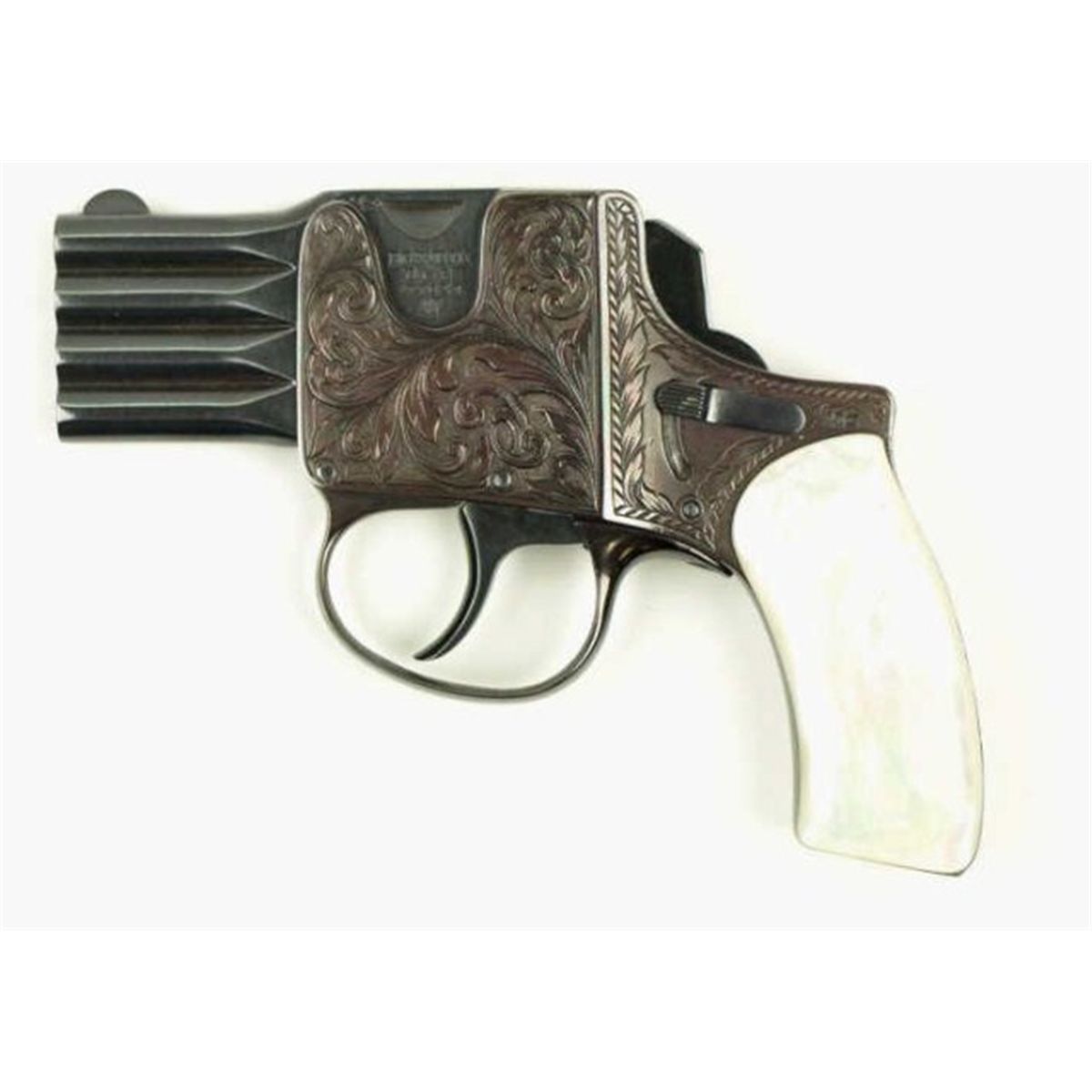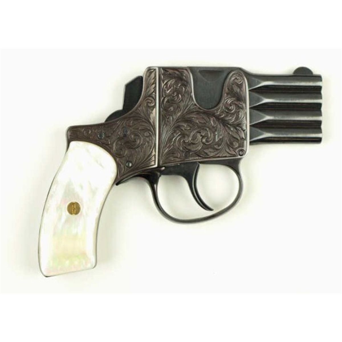 Reform Brevete .25 cal. SN 4427 4 stack barrel pistol, blued finish, nicely executed scroll engraving signed "Shostle" to frame and backstrap with mother of pearl grips. Unique pistol with climbing action with 3" barrels, 5 1/2" overall. Beautifully restored with good action and fair bores. Stamped crown over "N" Belgium proof, left side of barrels marked BRAVETE DRP 177023 with additional EAGLE PROOF. FFL required.