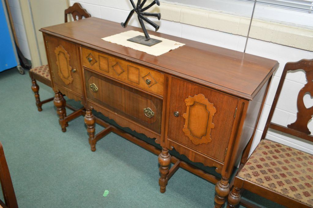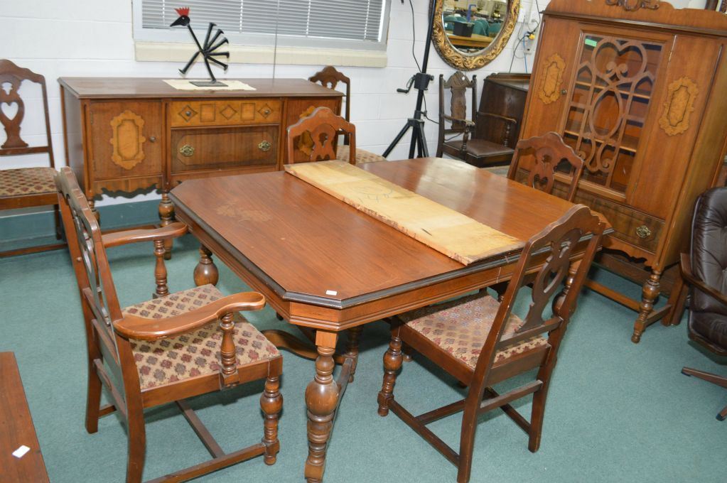 Refractory style nine piece walnut dining room suite including table with leaf, six chairs including one carver, sideboard and china cabinet