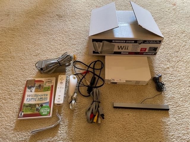 Refurbished Nintendo Wii. Comes with cables, sensor bar and 1 controller + nunchuk. Also comes with Wii Sports game.