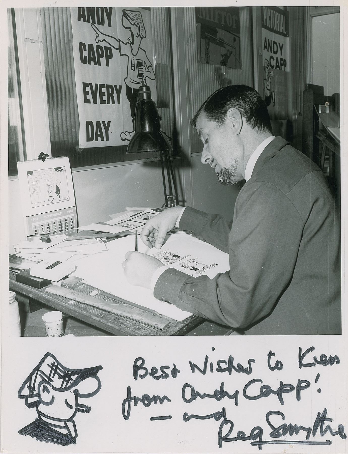 Glossy 6.5 x 8.5 photo of Smythe seated at his drawing table and working on a comic strip, signed and inscribed in black felt tip, "Best wishes to Ken from Andy Capp!—and Reg Smythe," who adds a fantastic profile sketch of his famed cap-wearing comic character. Reverse bears a Daily Mirror/Ian Harris credit stamp. In fine condition, with a bit of light creasing.