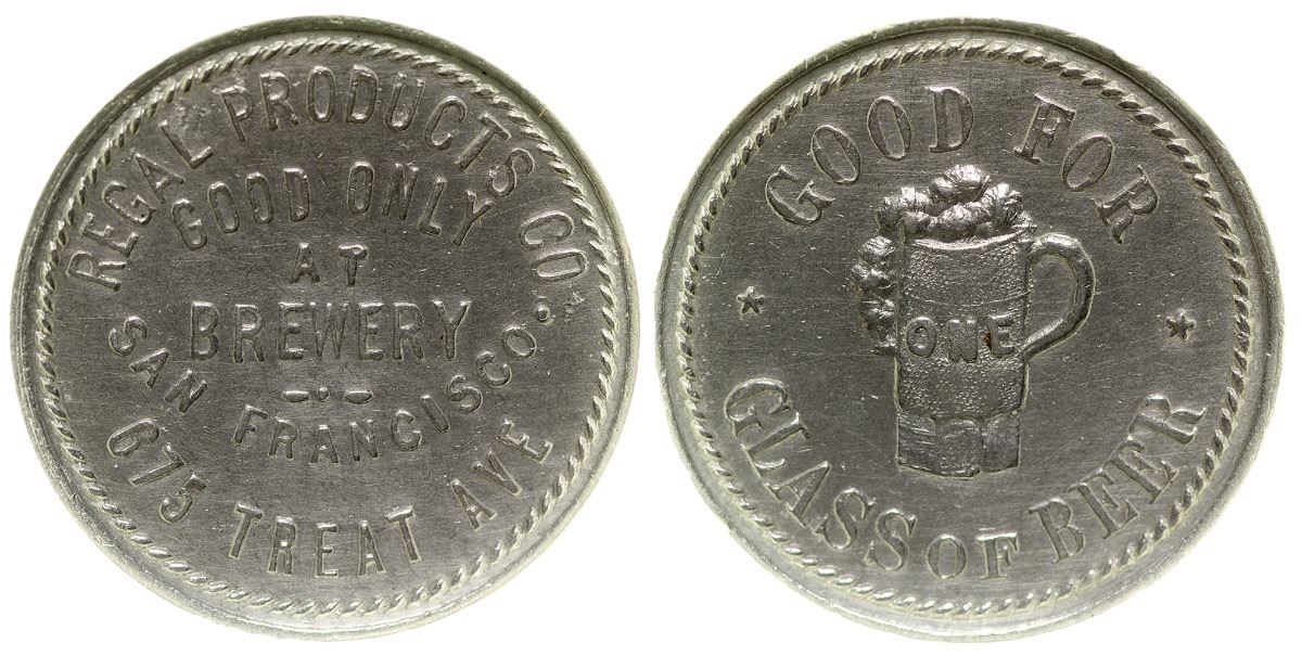 Genuine token for Regal Beer at their brewery in San Francisco. Has a pictorial mug of foaming beer on the back. Regal Products Co. / Good Only / At / Brewery / San Francisco. / 675 Treat Ave // GF / One / Glass of Beer. Round, Aluminum, 27mm. City: San Francisco State: California Inventory Number: 38938