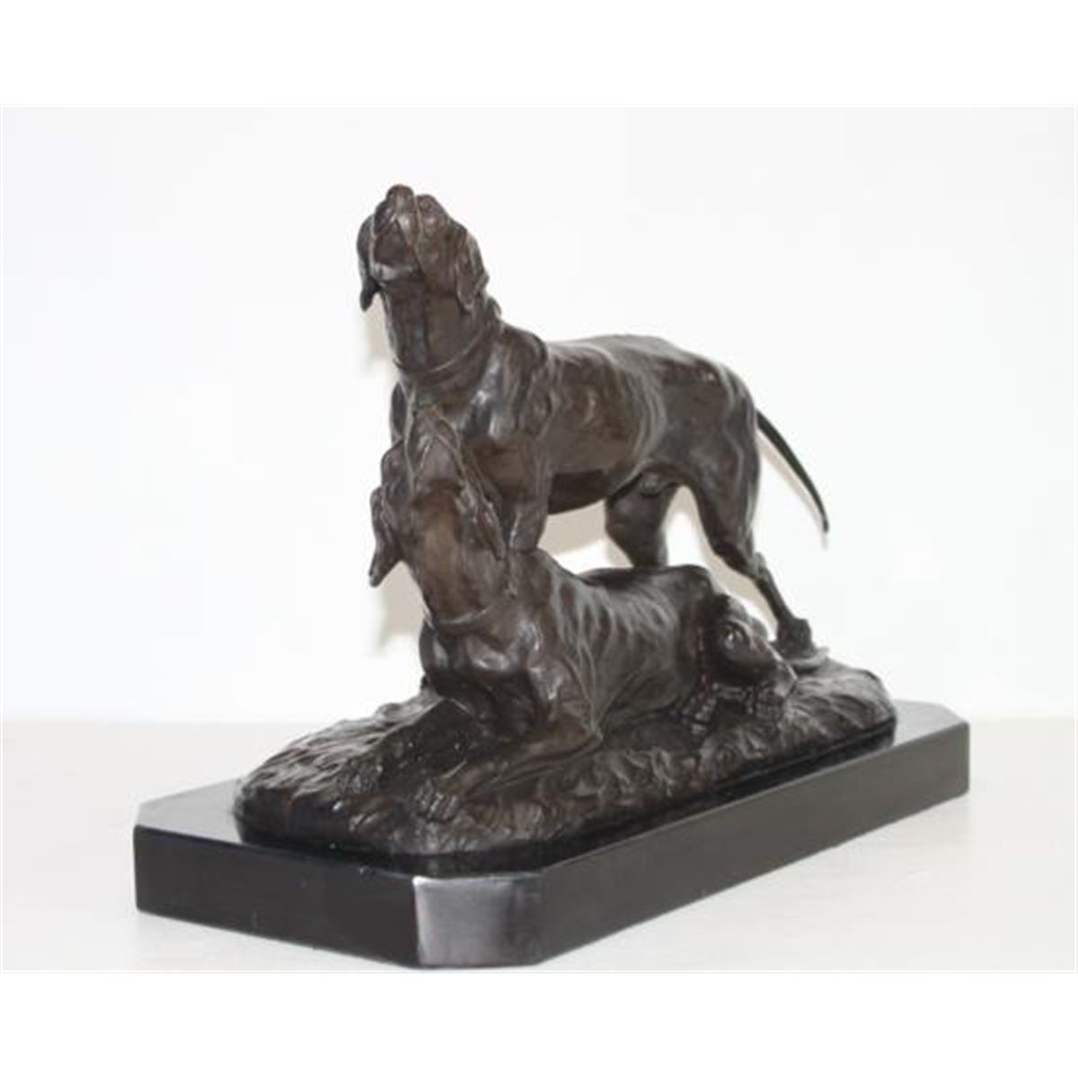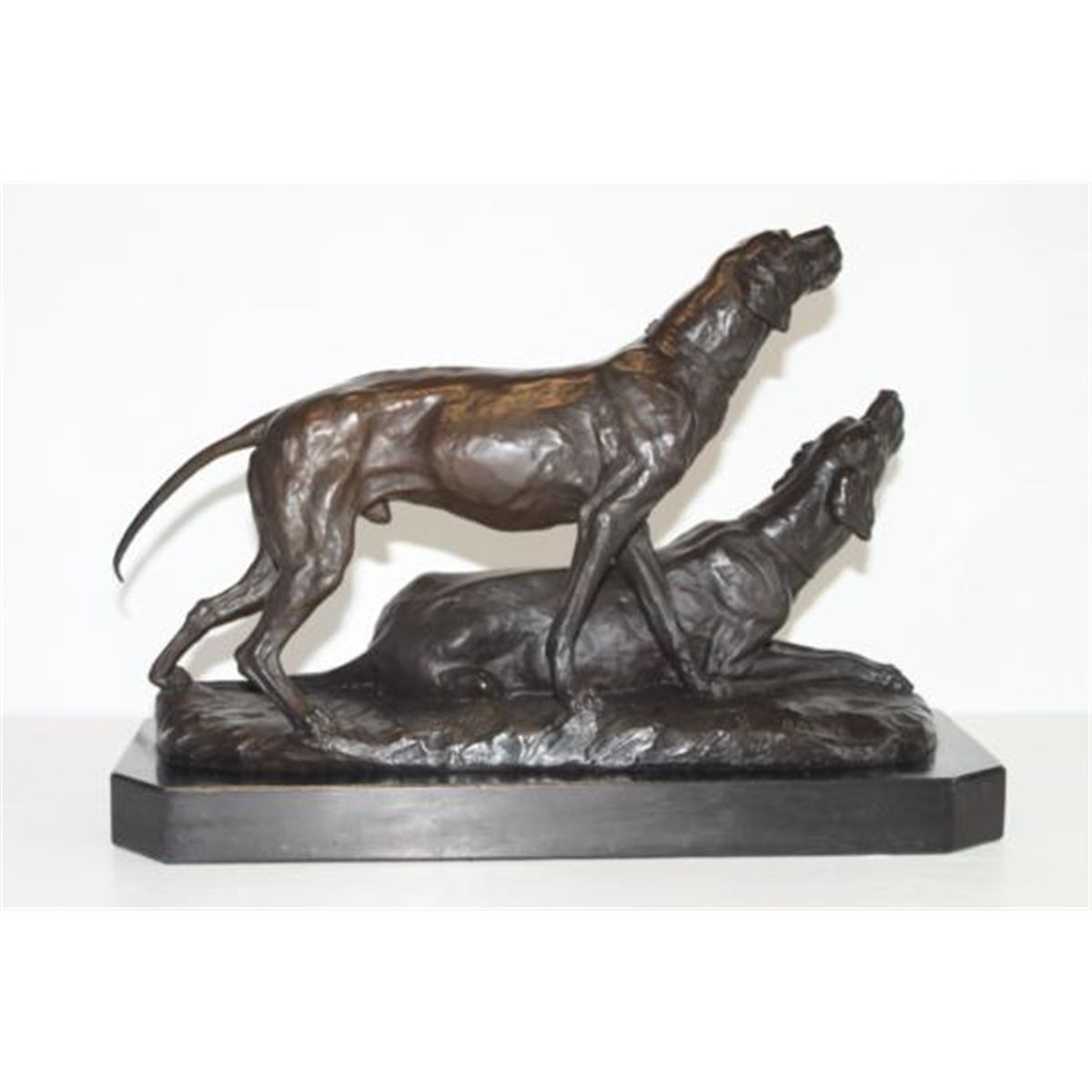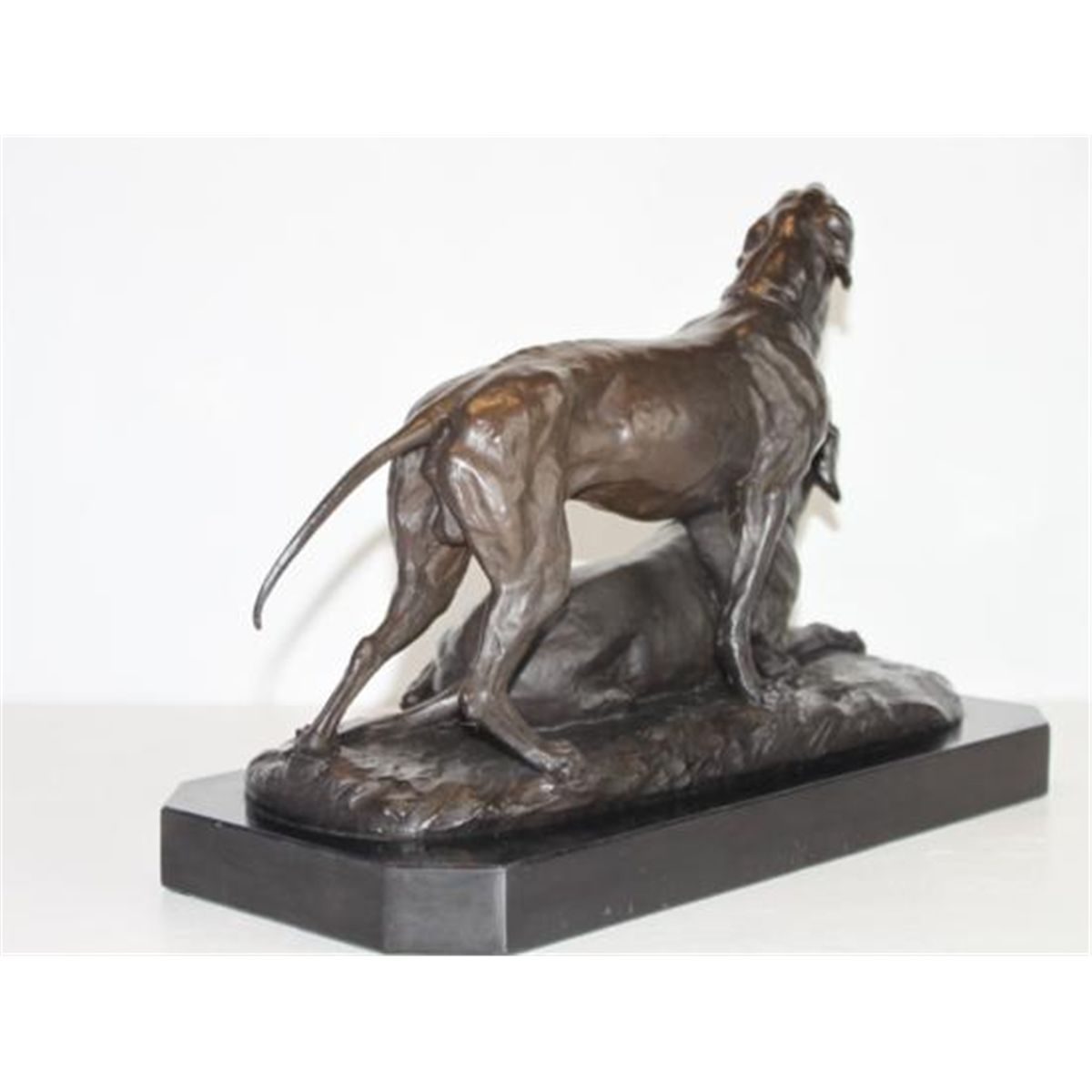 Hunting Dog Bronze Sculpture, After Barye, , 10 "H x 15"W x 7"D28 lbs. This bronze sculpture was produced using the "Lost Wax" casting method. The"Lost Wax" Cast method is the most precise metal casting technique in existence, ensuring exquisite detail of the original host model which is usually sculpted in clay or wax. This "Lost Wax" casting method is an extremely labor intensive and expensive process, but the end results produce a Heirloom Quality Masterpiece!Antoine-louis Barye (1796 - 1875) Originally trained as a goldsmith, Antoine-Louis Barye served in Napoleon's army before studying sculpture and painting. He entered the Ecole des Beaux-Arts in 1818 and adapted the romantic-style subject matter of violent and majestic animals. After his crocodile-like sculpture entitled Tiger Devouring a Gavail, won a medal at the Salon of 1831, Barye became a successful and independent sculptor and painter. His animal sculptures competed at the Salon alongside the more traditional and revered human figures. In 1845, Barye began a foundry that produced smaller and more affordable bronze statues. He was appointed the keeper of plaster casts at the Louvre and professor of zoological drawing at the Musee National d'Histoire Naturelle, both in Paris. Elected to the Academie in 1868, Barye inspired a later generation of animal sculptors who called themselves the animaliers.