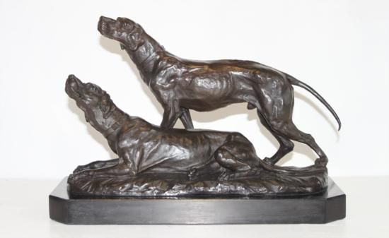 Hunting Dog Bronze Sculpture, After Barye, , 10 "H x 15"W x 7"D28 lbs. This bronze sculpture was produced using the "Lost Wax" casting method. The"Lost Wax" Cast method is the most precise metal casting technique in existence, ensuring exquisite detail of the original host model which is usually sculpted in clay or wax. This "Lost Wax" casting method is an extremely labor intensive and expensive process, but the end results produce a Heirloom Quality Masterpiece!Antoine-louis Barye (1796 - 1875) Originally trained as a goldsmith, Antoine-Louis Barye served in Napoleon's army before studying sculpture and painting. He entered the Ecole des Beaux-Arts in 1818 and adapted the romantic-style subject matter of violent and majestic animals. After his crocodile-like sculpture entitled Tiger Devouring a Gavail, won a medal at the Salon of 1831, Barye became a successful and independent sculptor and painter. His animal sculptures competed at the Salon alongside the more traditional and revered human figures. In 1845, Barye began a foundry that produced smaller and more affordable bronze statues. He was appointed the keeper of plaster casts at the Louvre and professor of zoological drawing at the Musee National d'Histoire Naturelle, both in Paris. Elected to the Academie in 1868, Barye inspired a later generation of animal sculptors who called themselves the animaliers.