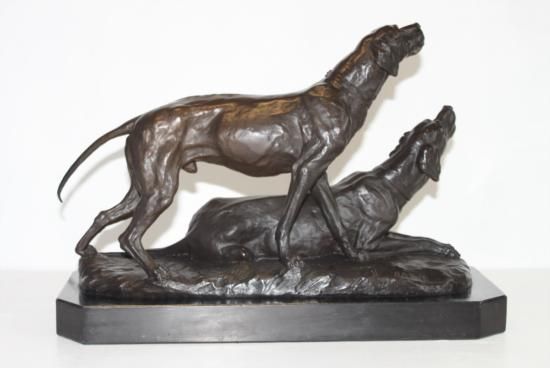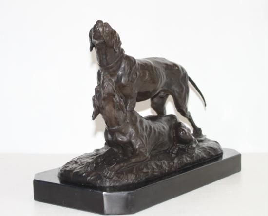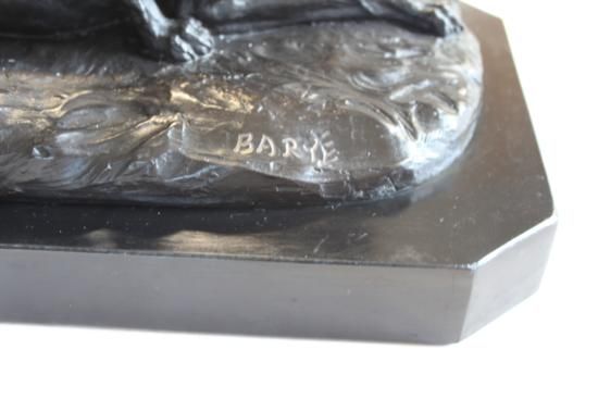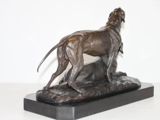 Hunting Dog Bronze Sculpture, After Barye, , 10 "H x 15"W x 7"D28 lbs. This bronze sculpture was produced using the "Lost Wax" casting method. The"Lost Wax" Cast method is the most precise metal casting technique in existence, ensuring exquisite detail of the original host model which is usually sculpted in clay or wax. This "Lost Wax" casting method is an extremely labor intensive and expensive process, but the end results produce a Heirloom Quality Masterpiece!Antoine-louis Barye (1796 - 1875) Originally trained as a goldsmith, Antoine-Louis Barye served in Napoleon's army before studying sculpture and painting. He entered the Ecole des Beaux-Arts in 1818 and adapted the romantic-style subject matter of violent and majestic animals. After his crocodile-like sculpture entitled Tiger Devouring a Gavail, won a medal at the Salon of 1831, Barye became a successful and independent sculptor and painter. His animal sculptures competed at the Salon alongside the more traditional and revered human figures. In 1845, Barye began a foundry that produced smaller and more affordable bronze statues. He was appointed the keeper of plaster casts at the Louvre and professor of zoological drawing at the Musee National d'Histoire Naturelle, both in Paris. Elected to the Academie in 1868, Barye inspired a later generation of animal sculptors who called themselves the animaliers.