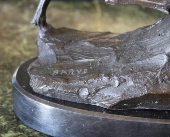 Ram on a Rock Edge Bronze Sculpture, After Barye - 16"H x 12"L x 5"D 15lbs. This bronze sculpture was produced using the "Lost Wax" casting method. The"Lost Wax" Cast method is the most precise metal casting technique in existence, ensuring exquisite detail of the original host model which is usually sculpted in clay or wax. This "Lost Wax" casting method is an extremely labor intensive and expensive process, but the end results produce a Heirloom Quality Masterpiece!Antoine-louis Barye (1796 - 1875) Originally trained as a goldsmith, Antoine-Louis Barye served in Napoleon's army before studying sculpture and painting. He entered the Ecole des Beaux-Arts in 1818 and adapted the romantic-style subject matter of violent and majestic animals. After his crocodile-like sculpture entitled Tiger Devouring a Gavail, won a medal at the Salon of 1831, Barye became a successful and independent sculptor and painter. His animal sculptures competed at the Salon alongside the more traditional and revered human figures. In 1845, Barye began a foundry that produced smaller and more affordable bronze statues. He was appointed the keeper of plaster casts at the Louvre and professor of zoological drawing at the Musee National d'Histoire Naturelle, both in Paris. Elected to the Academie in 1868, Barye inspired a later generation of animal sculptors who called themselves the animaliers.