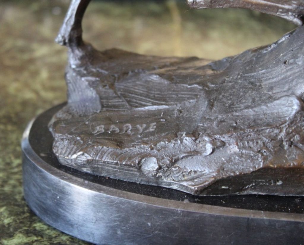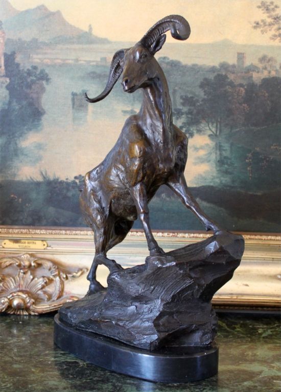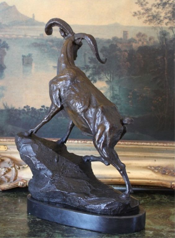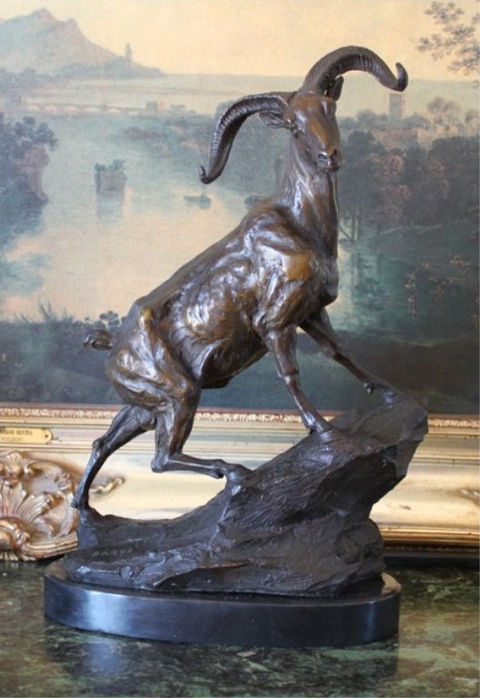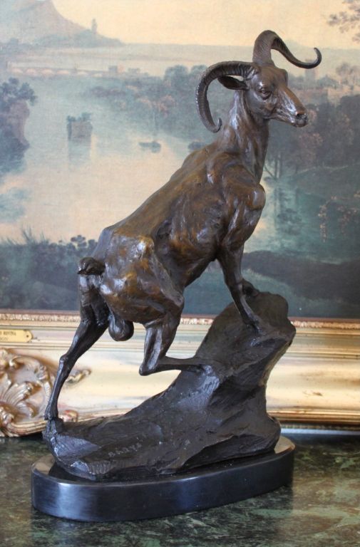 Ram on a Rock Edge Bronze Sculpture After Bayre 16H x 12L x 5D 15lbs. This bronze sculpture was produced using the "Lost Wax" casting method. The"Lost Wax" Cast method is the most precise metal casting technique in existence, ensuring exquisite detail of the original host model which is usually sculpted in clay or wax. This "Lost Wax" casting method is an extremely labor intensive and expensive process, but the end results produce a Heirloom Quality Masterpiece!