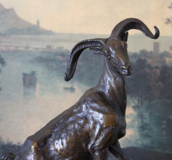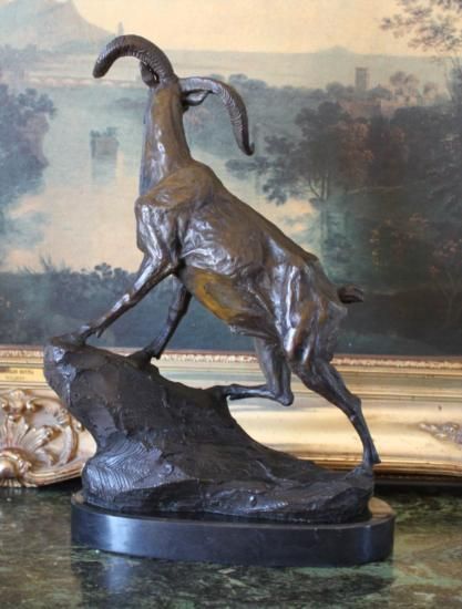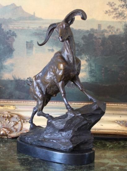 Ram on a Rock Edge Bronze Sculpture, After Bayre - 16"H x 12"L x 5"D 15lbs. This bronze sculpture was produced using the "Lost Wax" casting method. The"Lost Wax" Cast method is the most precise metal casting technique in existence, ensuring exquisite detail of the original host model which is usually sculpted in clay or wax. This "Lost Wax" casting method is an extremely labor intensive and expensive process, but the end results produce a Heirloom Quality Masterpiece!Antoine-louis Barye (1796 - 1875) Originally trained as a goldsmith, Antoine-Louis Barye served in Napoleon's army before studying sculpture and painting. He entered the Ecole des Beaux-Arts in 1818 and adapted the romantic-style subject matter of violent and majestic animals. After his crocodile-like sculpture entitled Tiger Devouring a Gavail, won a medal at the Salon of 1831, Barye became a successful and independent sculptor and painter. His animal sculptures competed at the Salon alongside the more traditional and revered human figures. In 1845, Barye began a foundry that produced smaller and more affordable bronze statues. He was appointed the keeper of plaster casts at the Louvre and professor of zoological drawing at the Musee National d'Histoire Naturelle, both in Paris. Elected to the Academie in 1868, Barye inspired a later generation of animal sculptors who called themselves the animaliers.