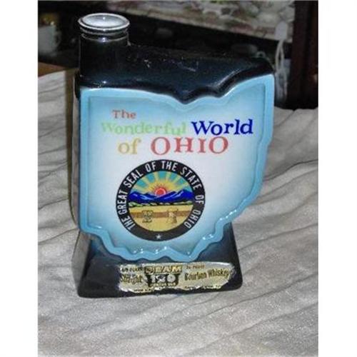 This " The Wonderful World of Ohio" whiskey decanter was produced in 1966 by the Regal China Company for the James B. Beam Distilling Company to promote tourism in Ohio. It is in the shape of the state of Ohio. It is 8 1/2 inches tall from the bottom to the top of the spout. It is 5 1/2 inches wide and 2 3/8 inches thick. It sports pictures on both sides: the front with "The Wonderful World of Ohio" in red (the campaign motto) and the Great Seal of the State of Ohio and the back with people engaged in fun activities and notable state production areas. The bottom reads "Creation of the James B. Beam Distilling Co./D-334-145-66/Genuine Regal China." <p>Shipping is determined after checkout. <p>
