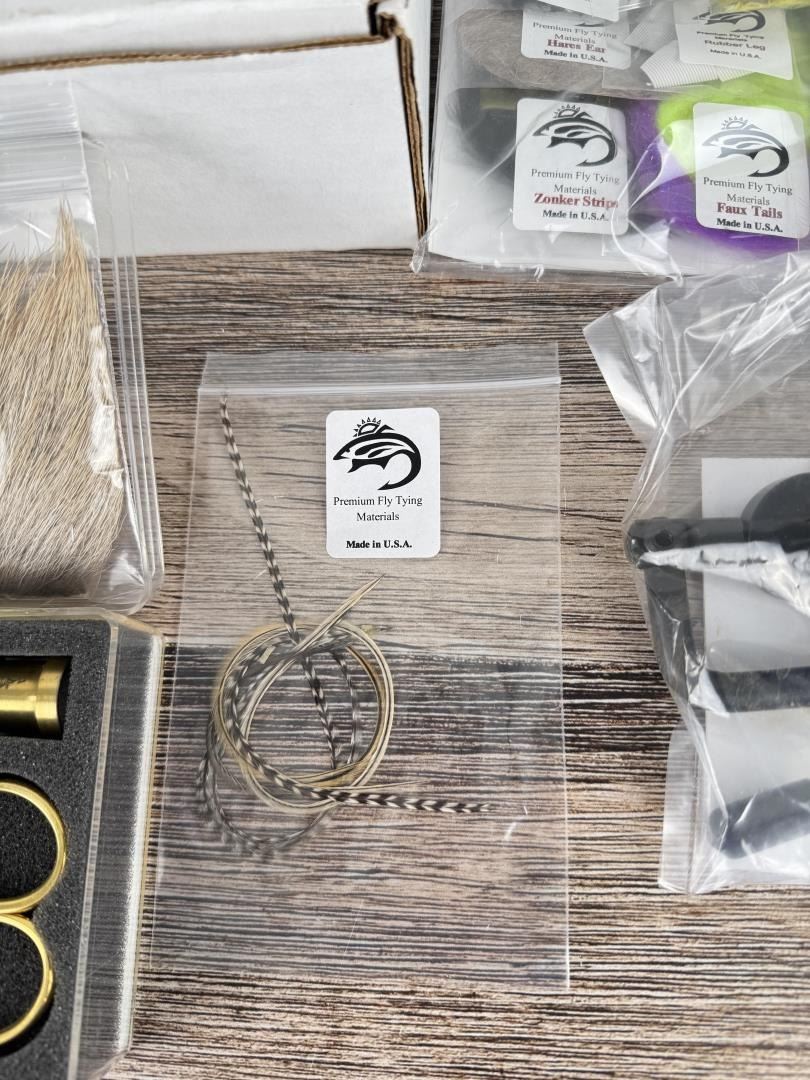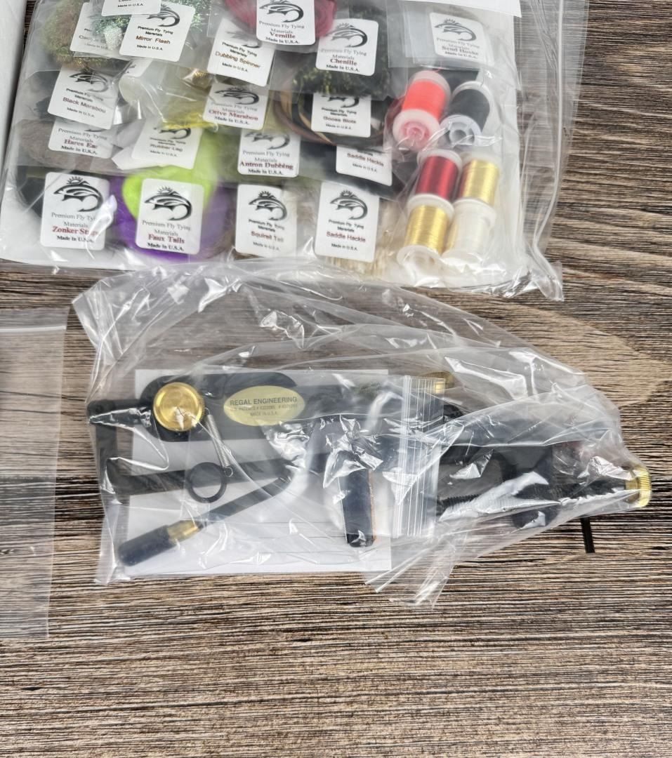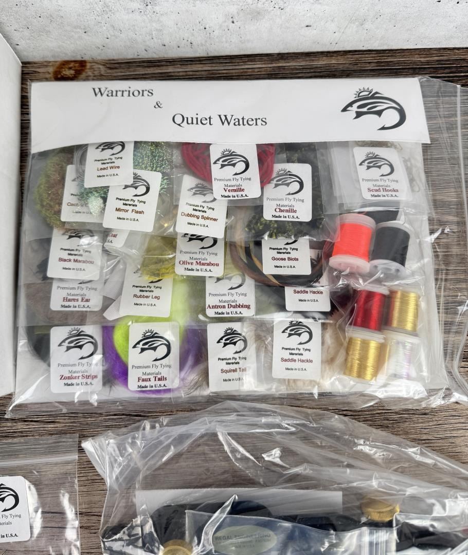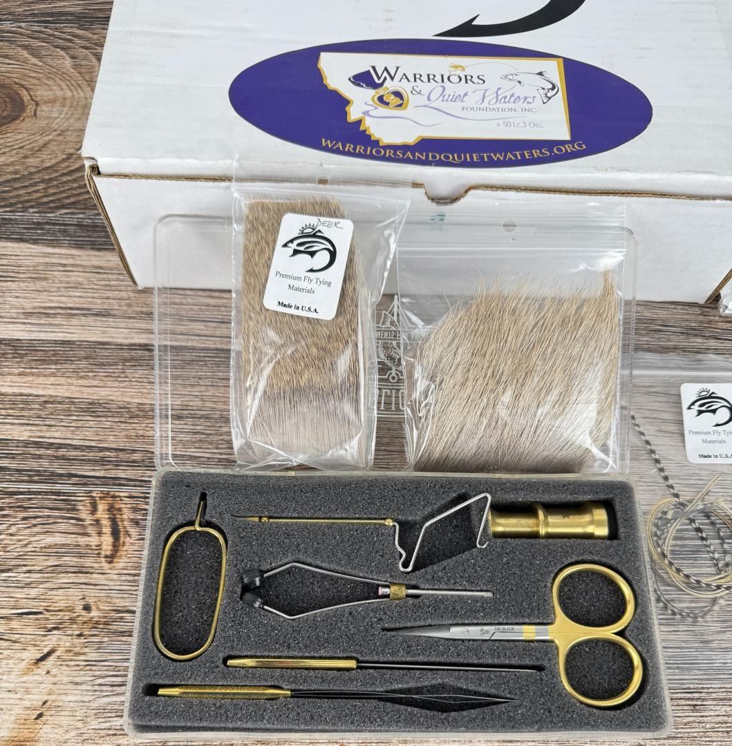 Fly tying kit and tools from Warriors and Quiet Waters Foundation from Missoula, MT. Regal vice, tools, and assorted hairs and line.