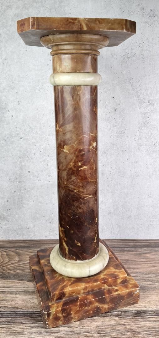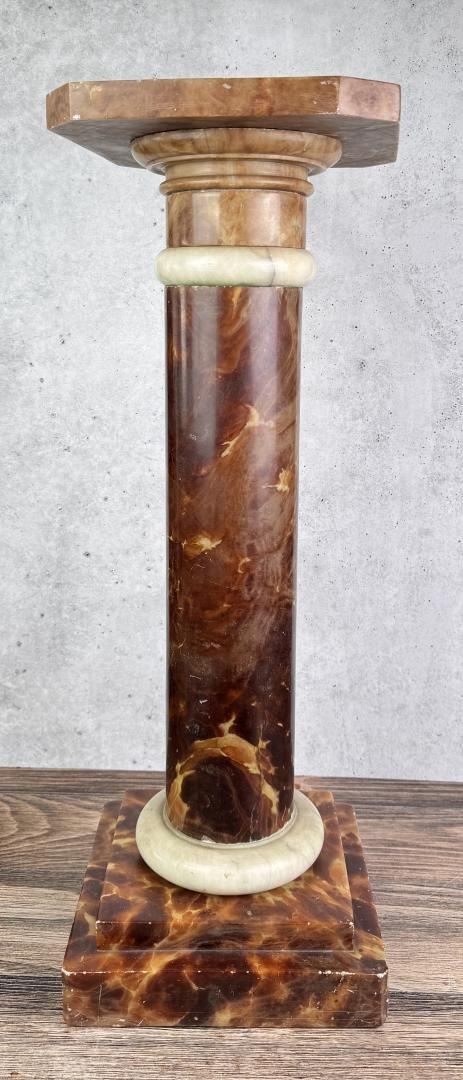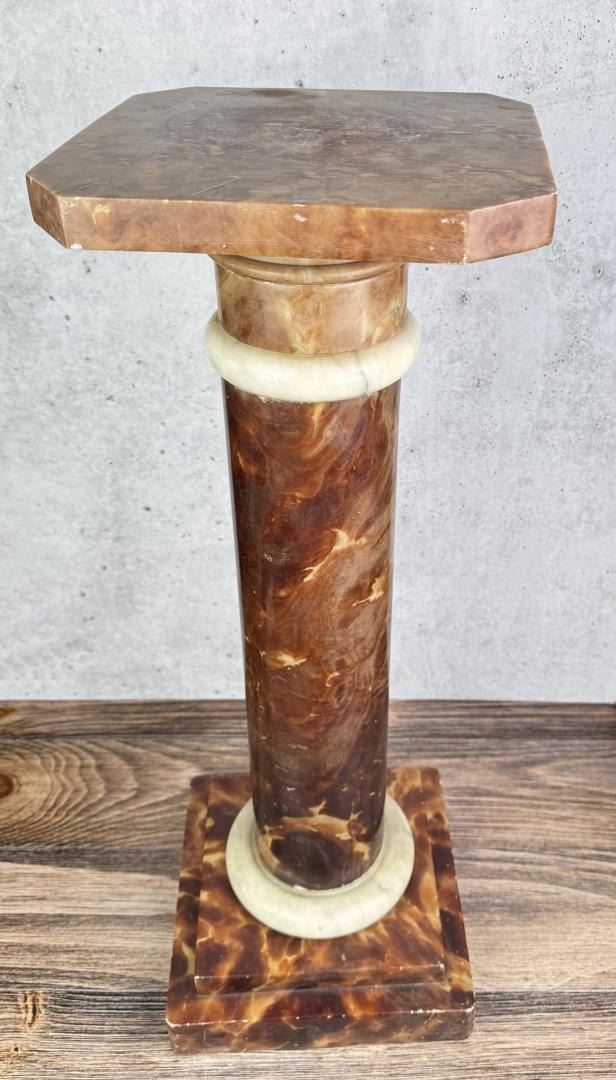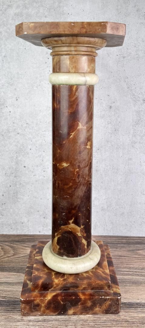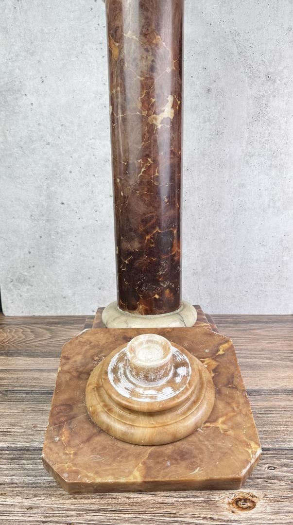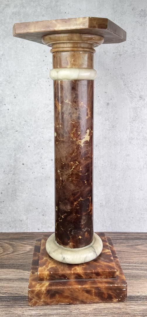 Top of stand is not affixed to the base. 10 3/4" by 10 3/4" by 29 1/2". Weighs just shy of 52 Pounds.