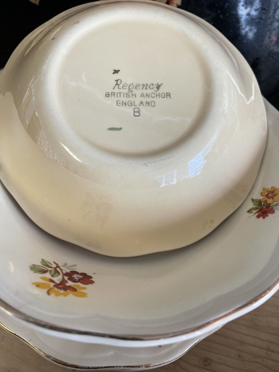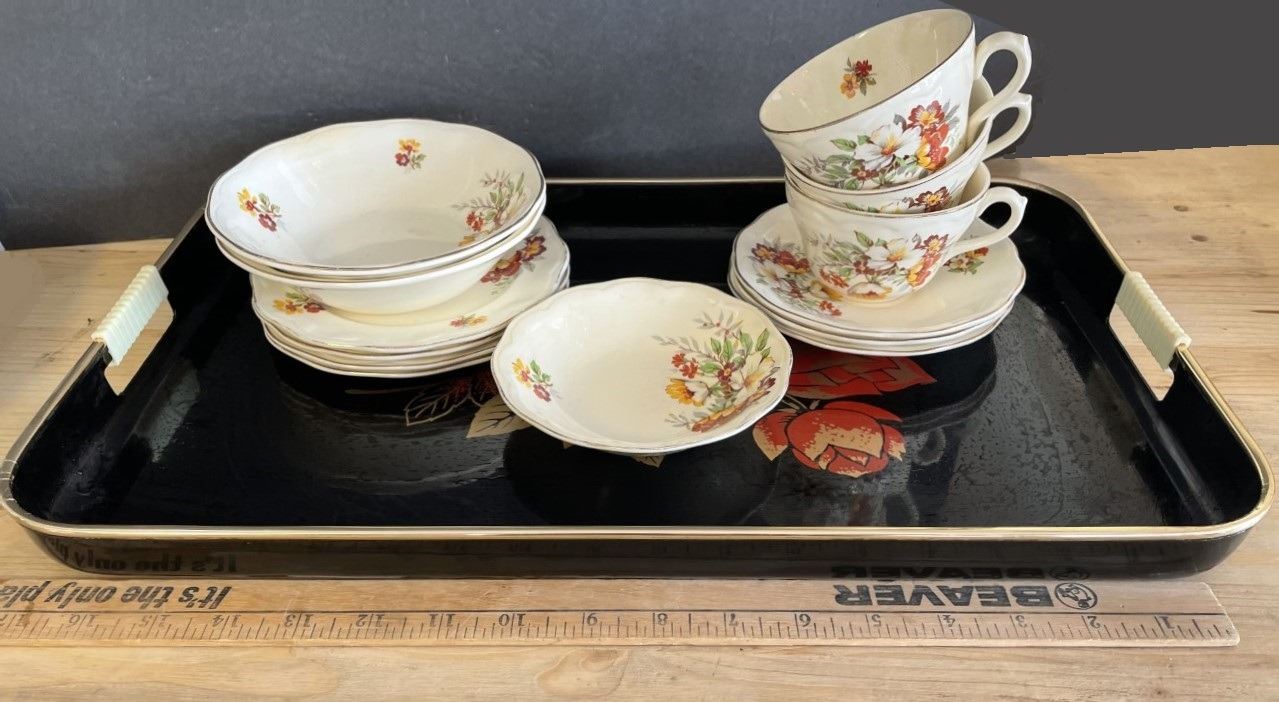 Three Tea Cups, Three Saucers, Four side Plates, Three Soup Bowls, One small bowl